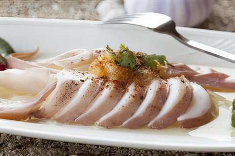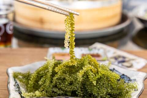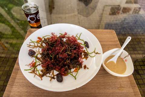 在養殖場對面,陳老闆貼心設置了用餐區,讓遊客能即刻享用現撈的美味。入口的海葡萄清脆爆珠,搭配泰式酸辣或日式和風醬,爽口又充滿層次,再品一杯澎湖特有的茶飲「風茹茶」,暑氣全消。產地看得見,更能安心享用海味。