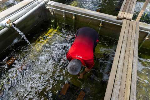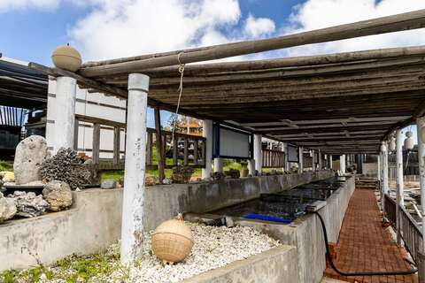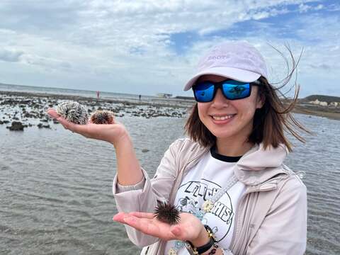 白灣坑漁場在澎湖農漁局輔導下,進行馬糞海膽的養殖。海膽喜歡隱身於岩石下,以藻類為食,與藻類形成循環共生。漁場特別設置共生池,呈現水域環境的生態樣貌,讓遊客更容易理解永續漁業的理念。