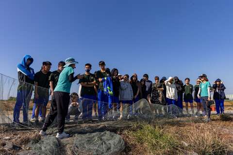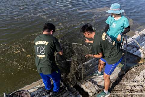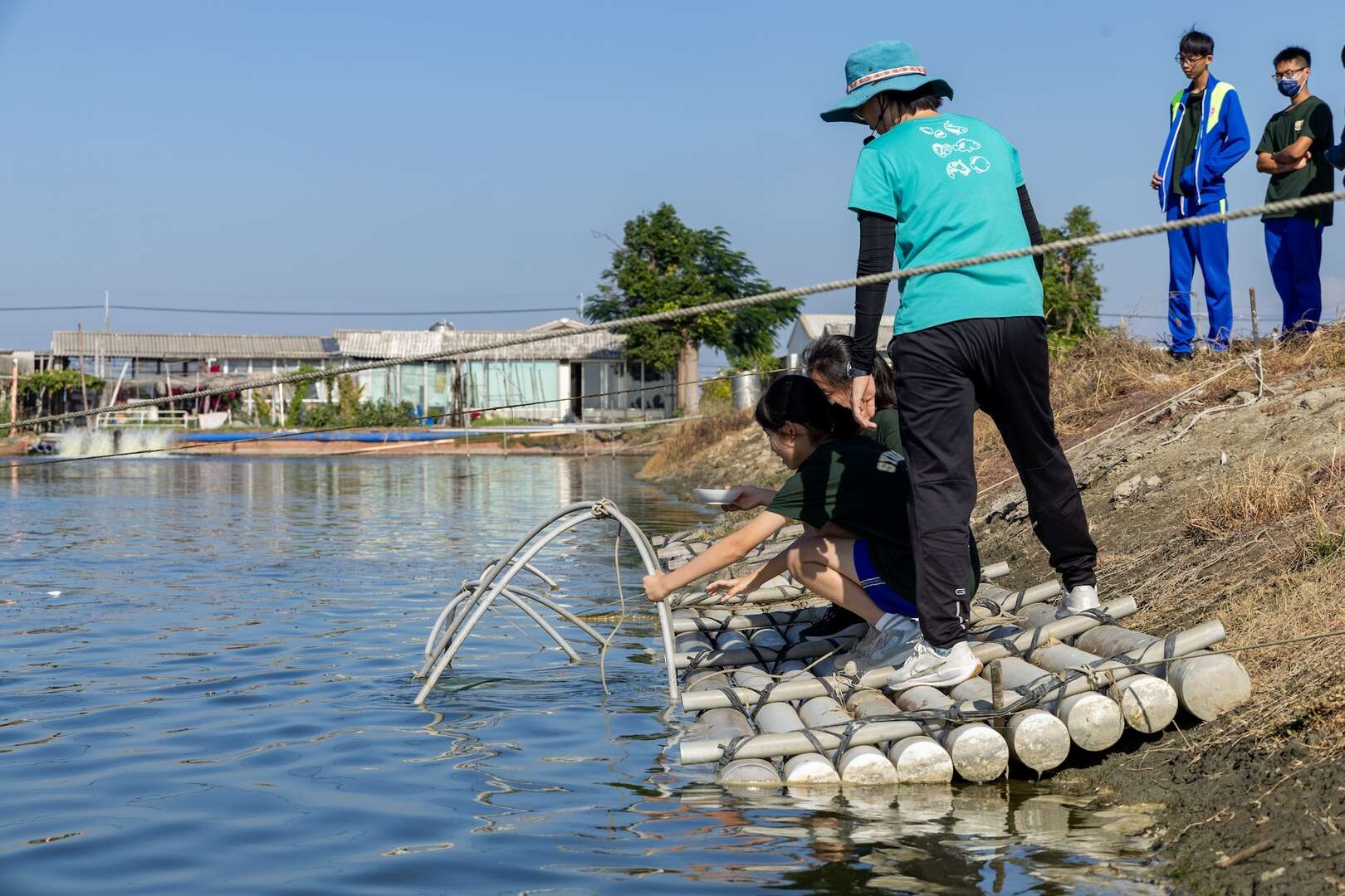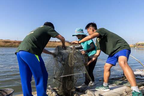 七股魚塭採行混養模式,白蝦、泰國蝦、螃蟹、烏魚與虱目魚在同一水域中共生,而石斑魚與螃蟹在池中扮演清道夫角色,啃食病死蝦隻,維持了養殖環境的生態平衡。走出室外,親自嘗試兩種不同的捕蝦方式,使用捕蝦網、捕蝦籠收成活跳白蝦。