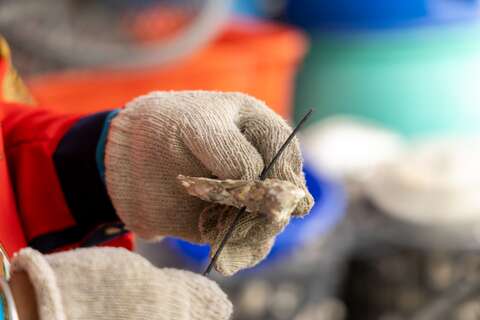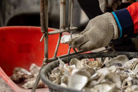 深入社區,為蚵殼打洞,將14塊蚵殼串起。冬至前後居民們將蚵串綁在北門潟湖的蚵棚中,讓隨波逐流的受精卵附著在蚵殼上,於海中慢慢生長,隔年中秋節後即可收成!