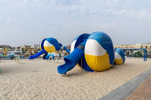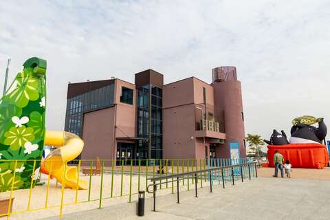 漁港另一頭的蚵子寮漁業親子館,結合海洋教育與漁業文化。室內設遊戲區、LEGO區與影音展牆,戶外設有鯨魚造型的大型溜滑梯與沙灘區,兼具教育性與趣味性。