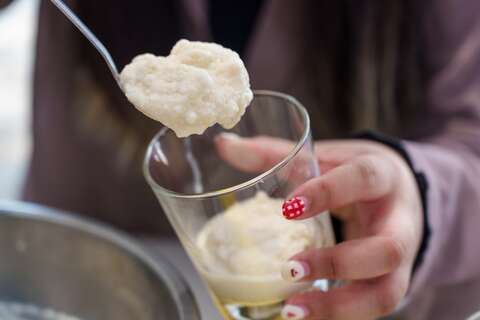夏季的「炒冰DIY」便是消暑又受歡迎的體驗活動之一,學員將裝有豆漿的金屬容器放置於冰鹽混合盆上,透過緩慢而持續的攪拌,原本流動的豆漿逐漸變得濃稠、結霜,最後變成期待的豆漿冰淇淋。過程中,講師會引導大家加入適量煉乳,說明油脂與糖分如何影響冰晶結構,讓成品從單純的冰沙,變成更柔軟的冰淇淋質地,讓大家在「動手做」的過程中,重新認識製作美食的奧妙與樂趣。