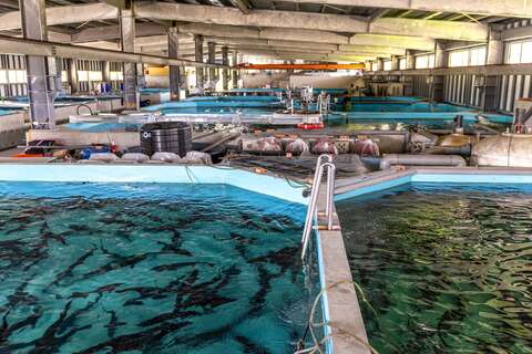 走進柯林漁廠,聞不到傳統魚塭的異味,取而代之的是整齊乾淨的魚池,即便外頭艷陽高照室內依舊涼爽,室內魚池分為兩區:一邊飼養鱘龍魚、一邊則為墨瑞鱈,戶外場域則養殖香魚,藉由冰涼的湧泉結合高品質的水循環、智慧監測與紫外線殺菌系統,有效掌握每個水池的溶氧量、魚隻健康等情況,並把養殖過濾的水維持一定的品質,優質的水產及鮮美的肉質,吸引一批穩定的客群購買。
