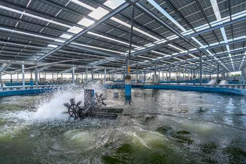 在供人參觀的台灣鯛創意樂園旁,有一座座鋪著太陽能光電板的室內智能養殖池,除了供電用於水質監測、自動餵食等之外,多餘的電力還能回售台電供給國家用電,加上太陽能板具有遮陰的作用,夏季能降溫、冬季則有保暖的效果,能夠有效增加魚隻的存活率,大幅避開傳統魚塭看天氣吃飯的因素。