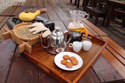 來到華山,不妨先以「華山遊客服務中心」為起點,這裡不僅是旅遊諮詢站,更是華山休閒農業區的咖啡文化體驗核心。與一般景點僅提供咖啡飲品不同,這裡強調的是讓遊客「從生豆到手中那一杯」的參與感,有專人引導遊客利用陶瓷烘豆壺「做」咖啡,還可善用咖啡樹的副產品,如手作咖啡樹枝鉛筆、手工皂等,最後還能讓遊客將自己烘培好的豆子進行研磨,製作成「濾掛包」,十分具有手作體驗的成就感。