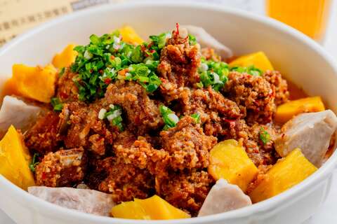 這道「農耕友善芋薯香」被譽為辦桌上的經典大菜,其繁複的烹調過程決定了排骨的極致軟嫩與入味:豬肋排先用蒜頭、酒、醬油醃製入味,隨後裹上一層由安泉米輾成的米穀粉。裹粉後的排骨必須放進蒸籠,蒸煮1.5小時,這個時長是為了確保排骨能被蒸熟並達到軟嫩的口感。上桌前,將蔥末淋上熱油再擺盤,激發出蔥香,完成這道鮮香大器的料理。