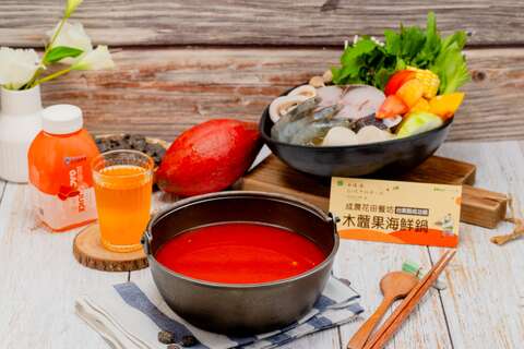 這鍋海鮮火鍋呈現緋紅吸睛的顏色,這是來自於「天堂的果實」——木鱉果。