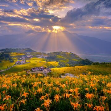 花蓮富里六十石山及玉里赤柯山,每到八至九月金針花季時都會有許多人專程前往賞往,因為滿山遍野的金針花黃澄澄美景實在太美麗,時而晴光乍現,時而雲霧飄渺,真的會讓人有置身秘境的感覺,吸引攝影愛好者及賞花遊客前往。