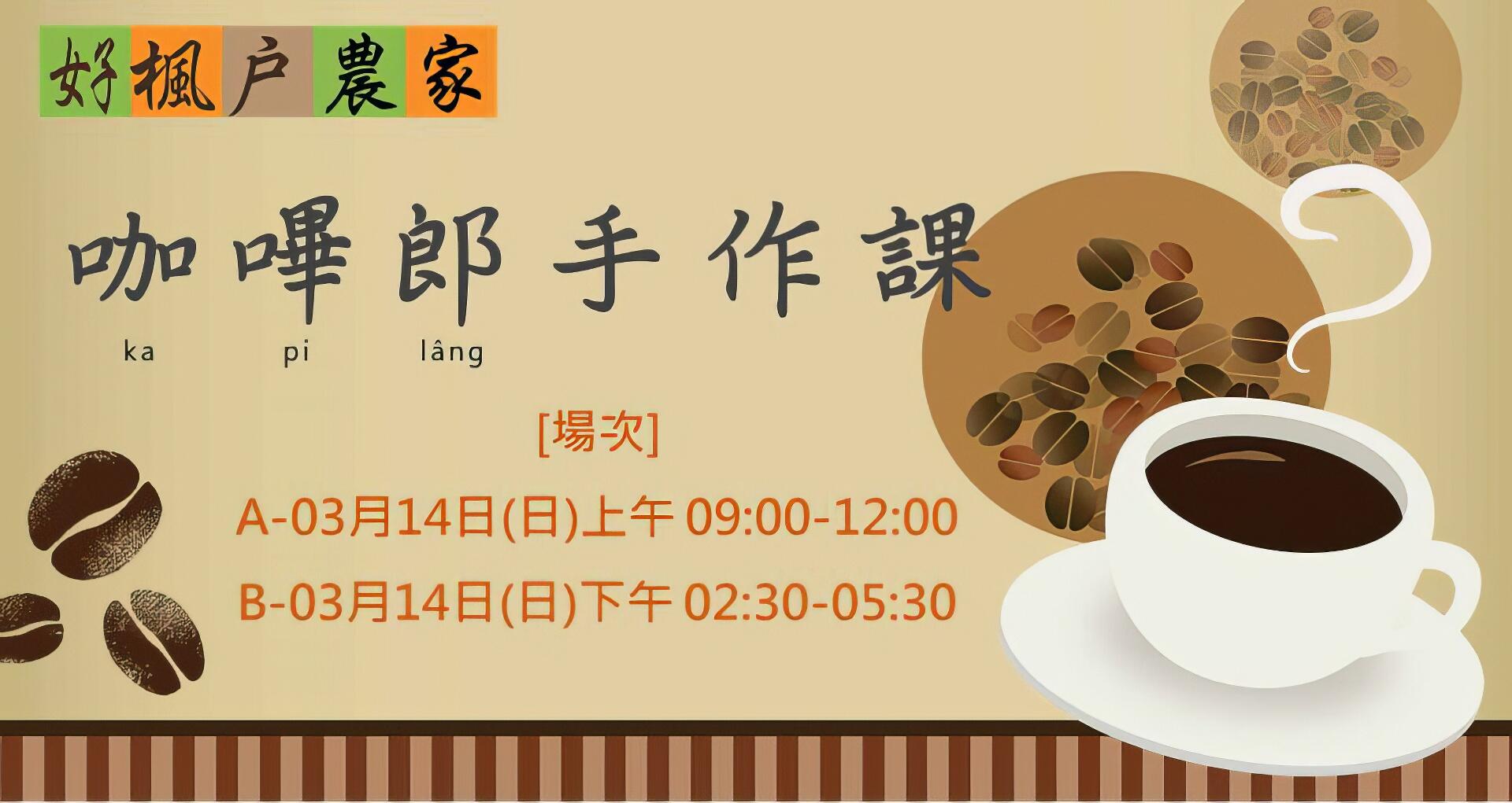 近年來有許多在地咖啡豆農投入生產,也有台灣咖啡豆品牌的出現。楓樹坑地區有好多位農友都有種植咖啡樹,好楓戶農家也種了百來株。現在正是咖啡豆採收的時節,想與大家分享咖啡生產過程,從產地到餐桌,認識咖啡的生態與加工方式,並動手體驗從咖啡果實到手中一杯咖啡,所需要歷經的工序,成為不僅會品嘗咖啡的美味,還能知豆識豆的咖嗶郎(ka-pi lâng)。