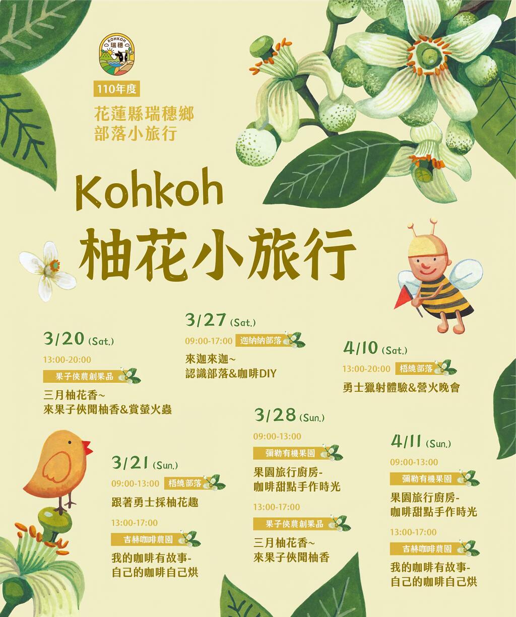 3月21日08點50分瑞穗火車站西站集合—跟著勇士採柚花趣—阿美姑娘秀文廚房上菜—我的咖啡有故事-自己的咖啡自己烘—3月21日17點賦歸溫暖的家。