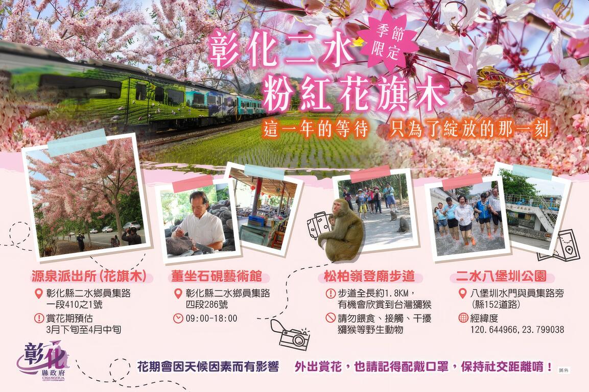 今年,終於等到了這一刻。 快拿起相機 帶上心愛的家人、朋友、情人, 來趟彰化二水粉紅花旗木的小旅行