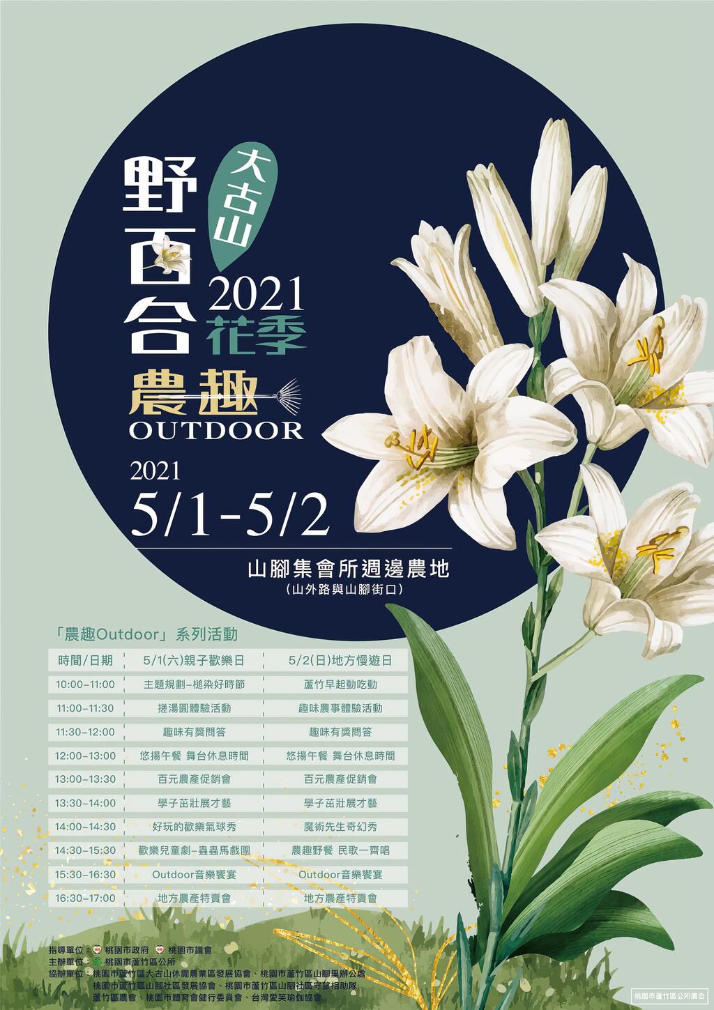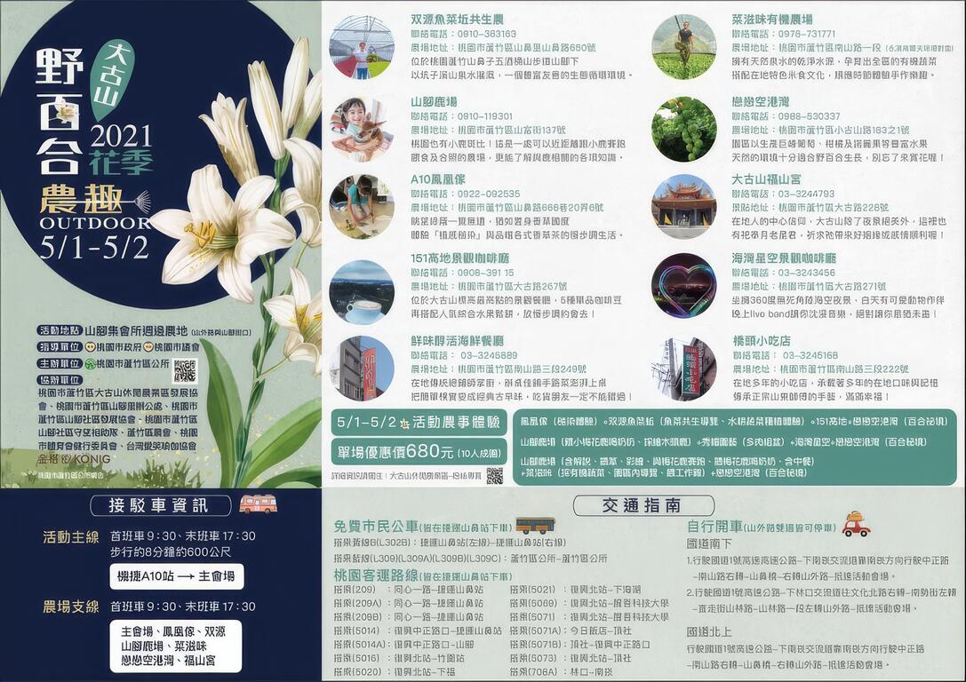 大古山休閒農業區每到4~5月時野百合會盛開,是台灣特有的原生種,其超高的發芽率與強韌的生長特色,常被視為台灣本土的精神代表,然而當一朵朵純白的花朵綻放搖曳,像極了百合仙子徜徉在青青草原上那般天真純淨,溫柔又堅韌的矛盾特質,造就了野百合的不凡,邀請您一起去賞花。