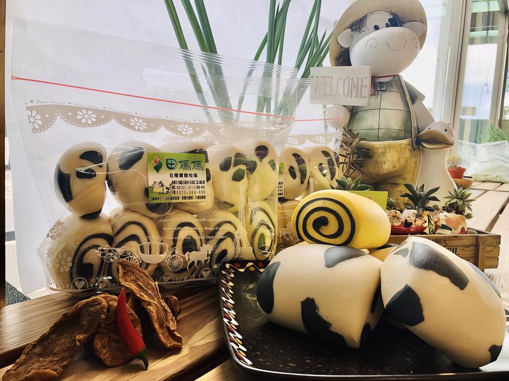 鮮奶起司棒、鮮奶吐司、乳牛斑點饅頭、鮮奶凍、黃金薯、芋頭酥、桂圓蛋糕