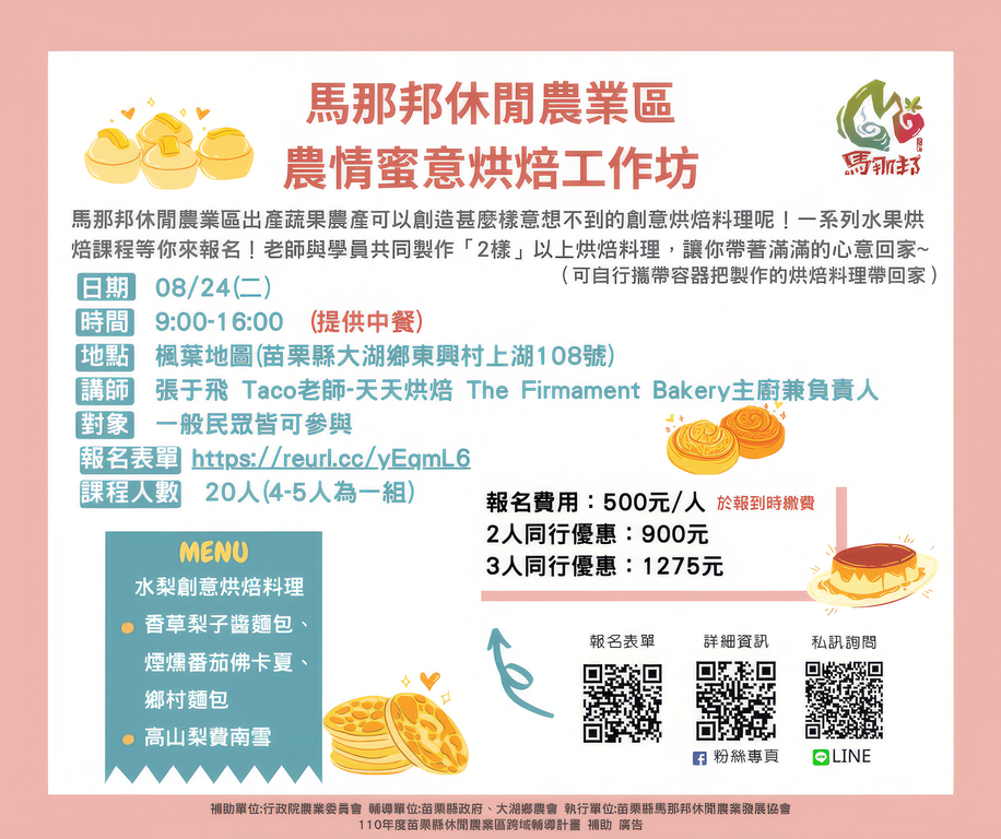 被美景環繞的馬那邦休閒農業區,四季皆有出產豐富的蔬果,休區內的楓葉地圖民宿準備了水梨、芭樂、甜柿三大主題,總共六堂充滿好吃好玩的創意烘焙教學活動,帶大家體驗在雲山環抱中製作料理的美好。