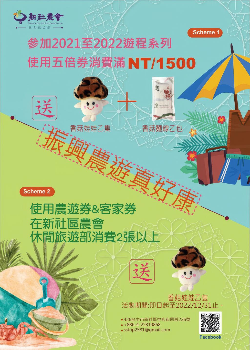 即日起至2022/12/31,使用農遊券&客庄券在新社區農會休閒旅遊部消費2張以上,即贈「香菇娃娃」乙隻!