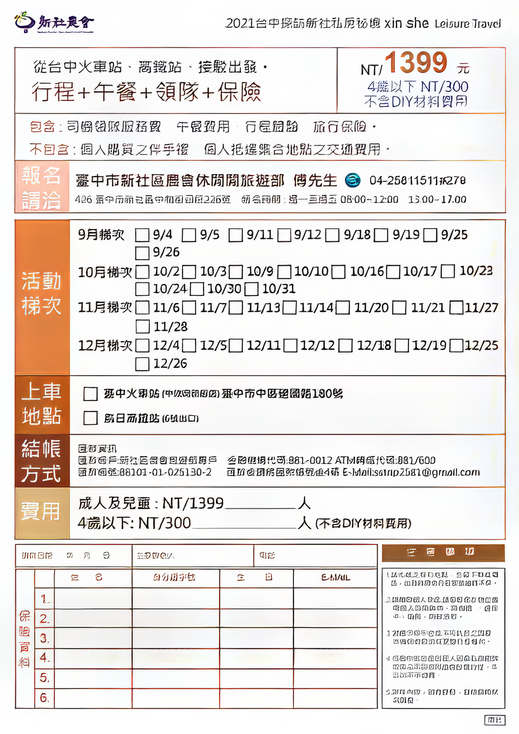 1. 請先確定報到地點,並留下連絡電話,出發時間依安排行程,逾時不候。