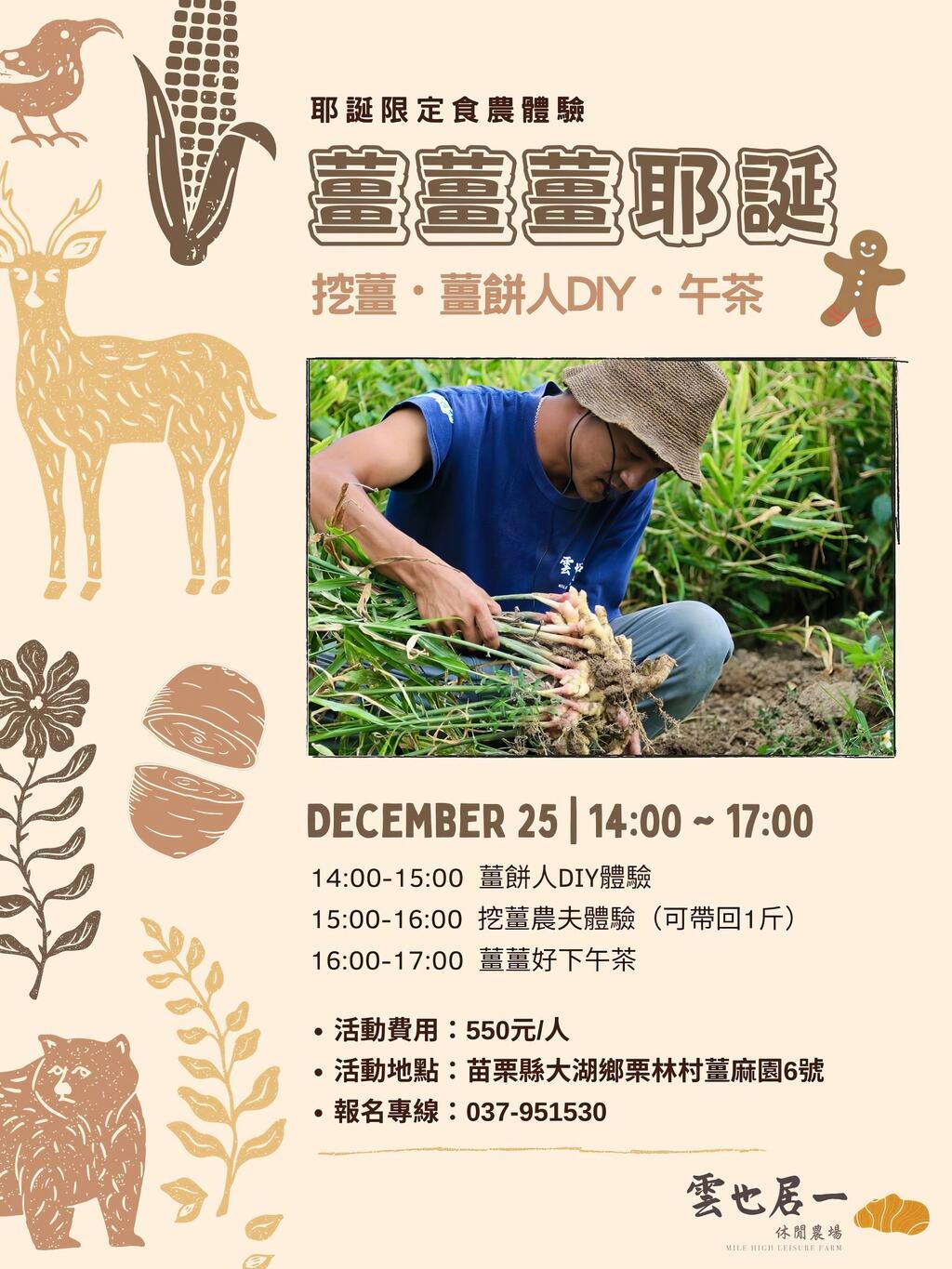 冷颼颼的冬天,許多人都會用薑來暖身、怯寒,偷偷告訴大家雲也居一休閒農場有優質老薑!配合聖誕節,還有製作薑餅人的DIY活動!這麼溫暖有趣的活動怎麼可以錯過呢?