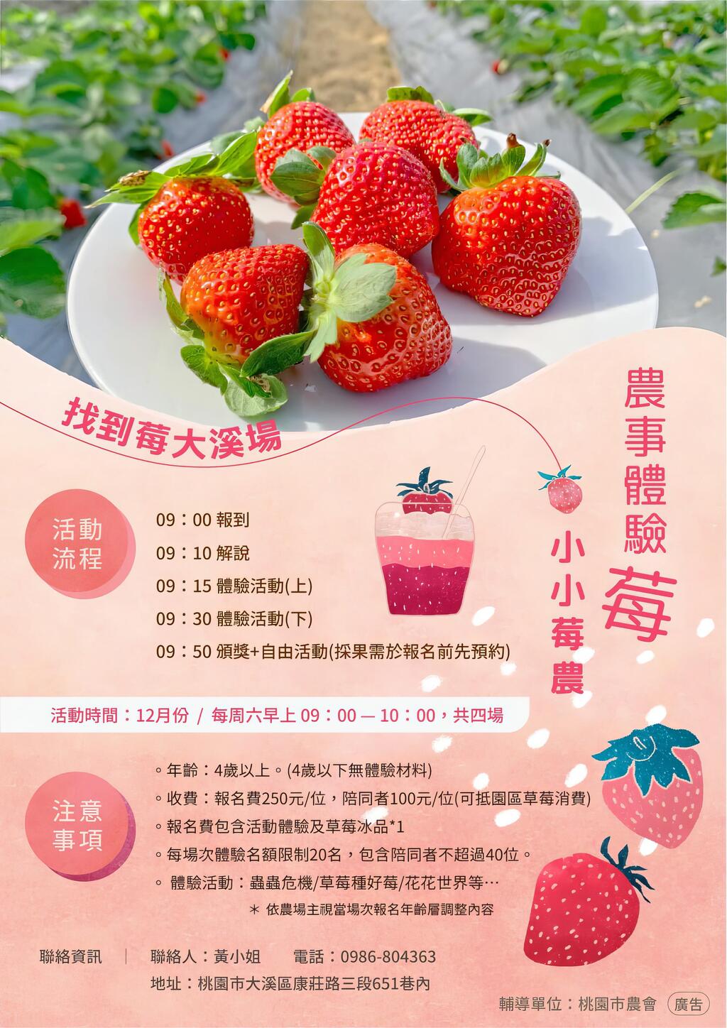 找到莓大溪場農事體驗活動來了!!!帶著家中大小朋友一起來體驗種草莓的樂趣,體驗活動完成後還有小點心可以吃,真是太期待了!