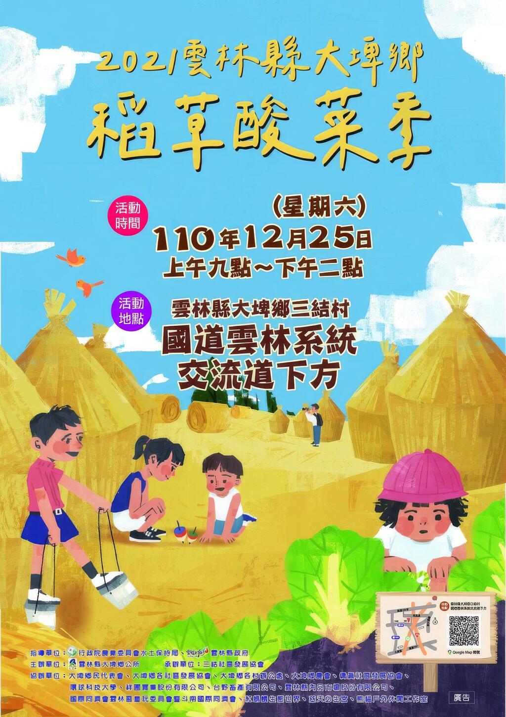 大埤稻草酸菜文化季準備好囉!今年設置了四個不同主題的專區,要帶大家逛市集、酸菜體驗、玩童玩和觀賞稻草創作藝術,除此之外,稻草藝術品將展示一個月的時間,歡迎大家前往同樂唷!