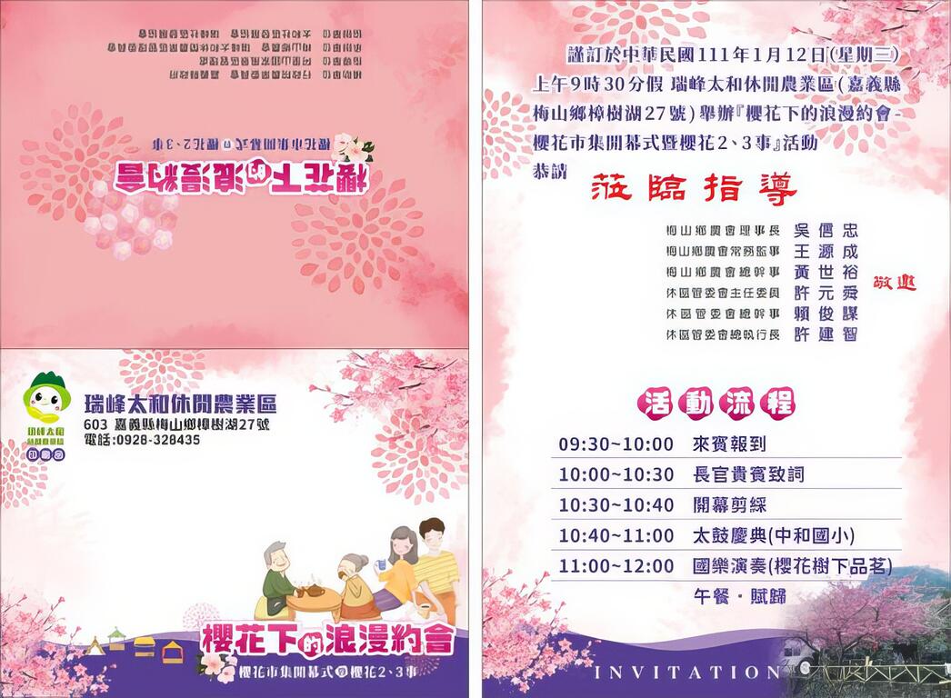 補助單位:行政院農業委員會、嘉義縣政府 指導單位:阿里山國家風景區管理處 承辦單位:梅山鄉農會、瑞峰太和休閒農業區管理委員會 協辦單位:瑞峰社區發展協會、太和社區發展協會