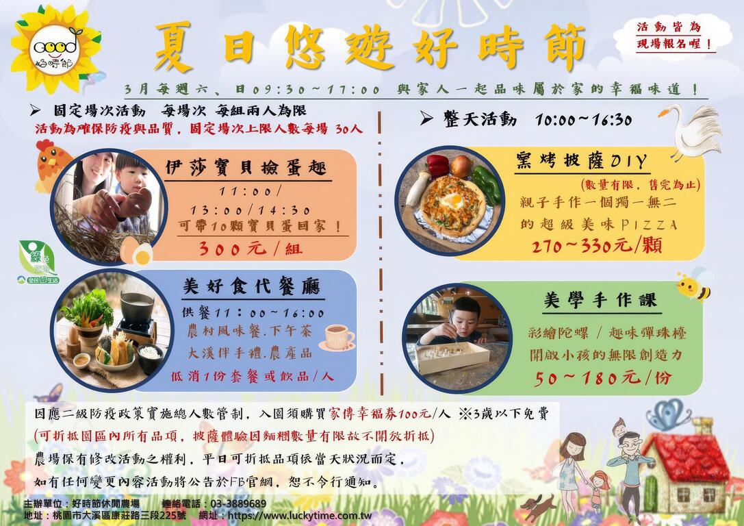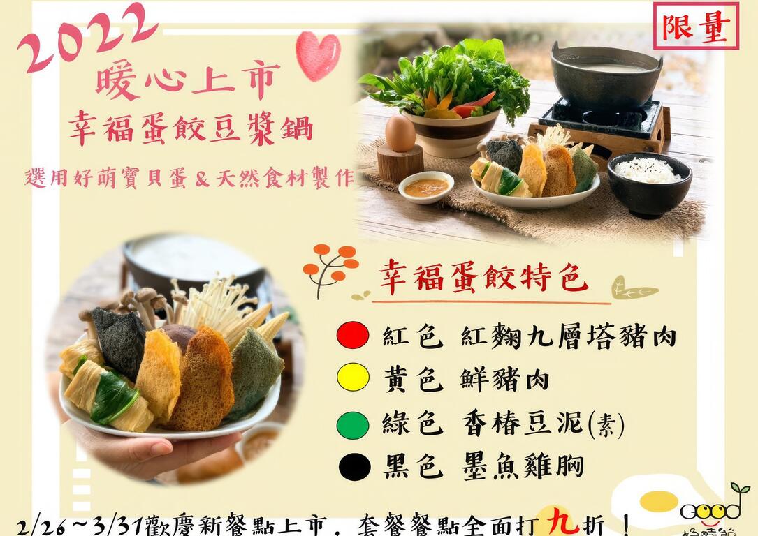 好時節3月活動場次出爐啦!活動現場報名即可,不用預約喔~另外,美好食代餐廳最新餐點「幸福蛋餃豆漿鍋」上市囉!歡迎大家來農場品嚐