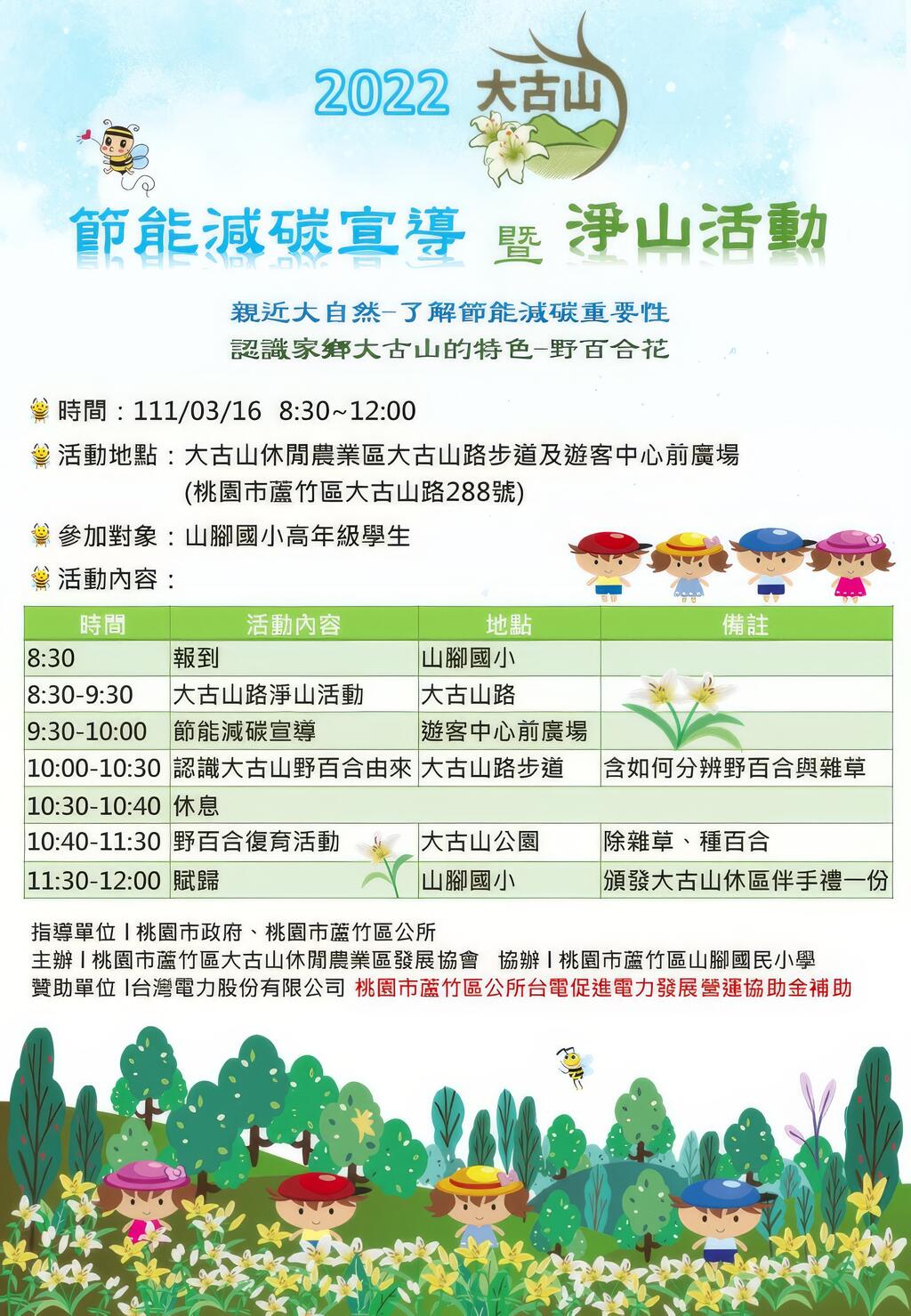 | 10:40-11:30 | 野百合復育活動 | 大古山公園 | 除雜草、種百合 |
