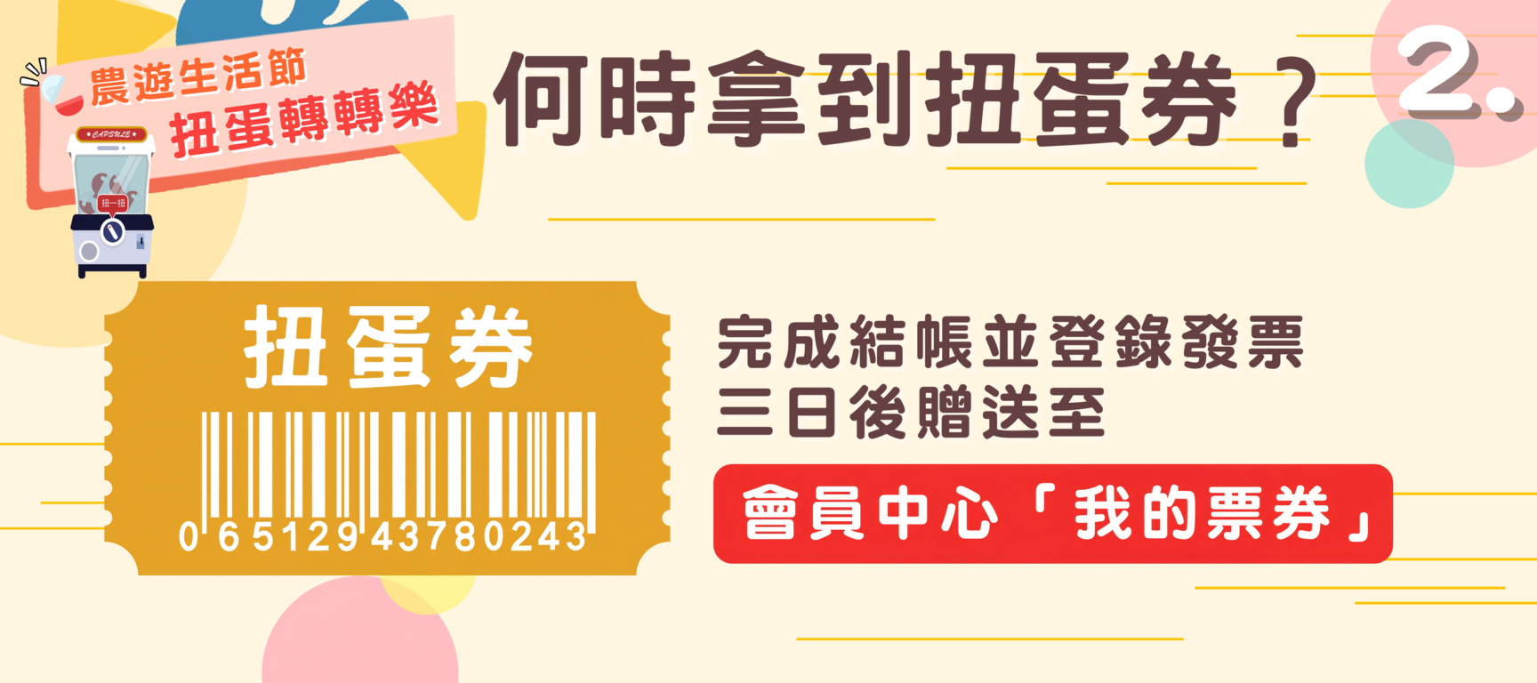 >>完成消費並上傳登錄發票,於3日後系統將自動贈送扭蛋券至會員中心「我的票券」
