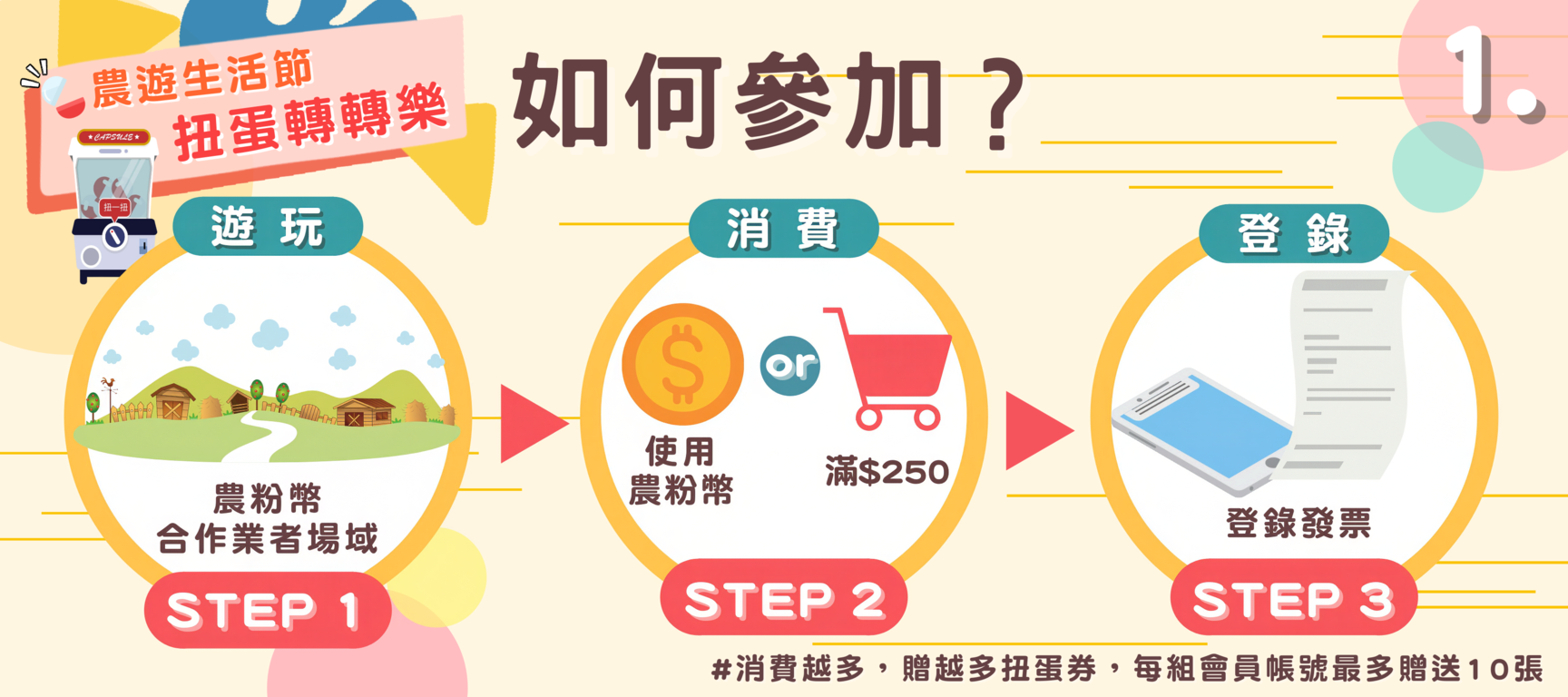 - 條件一:至農粉幣合作業者消費滿$250,贈一張扭蛋券(可累贈)。