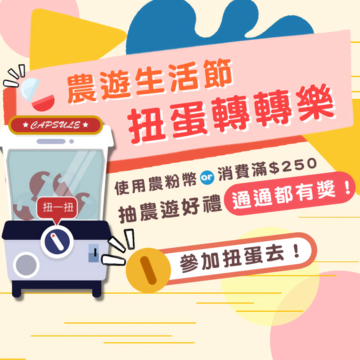 至農粉幣合作業者出遊消費使用農粉幣,或消費滿$250,就可以玩扭蛋抽大獎!