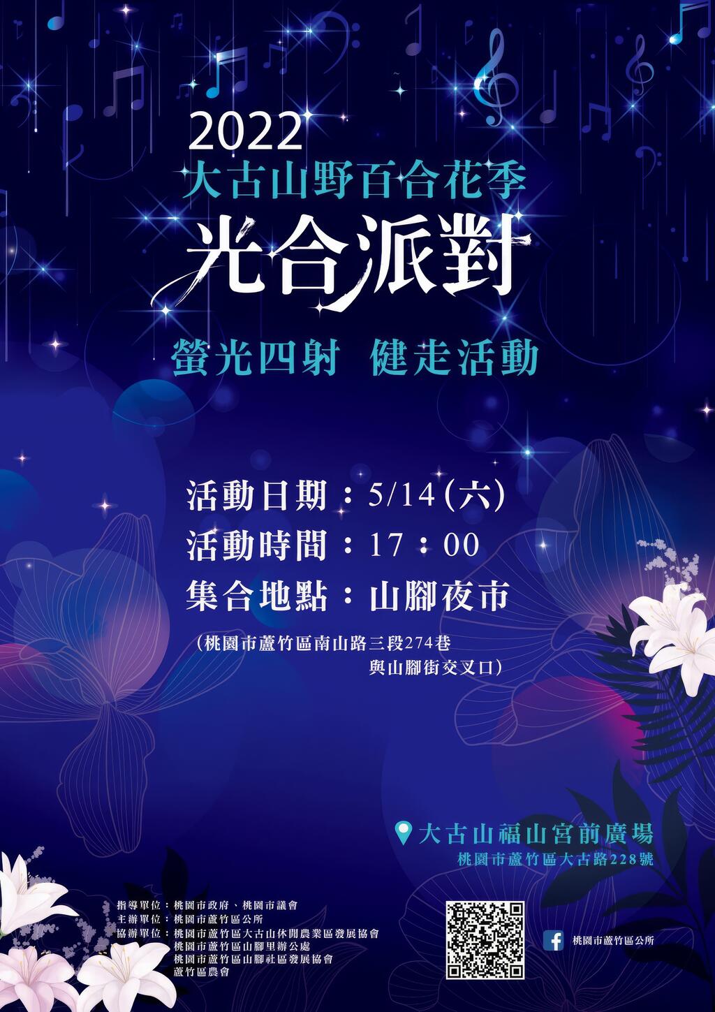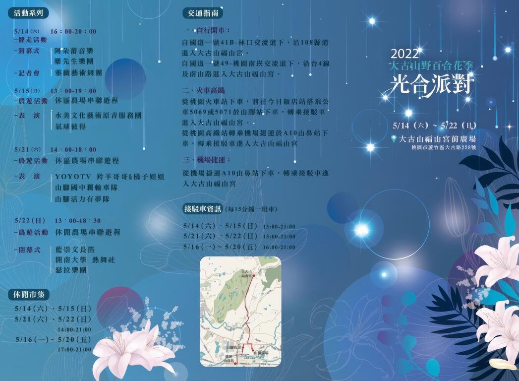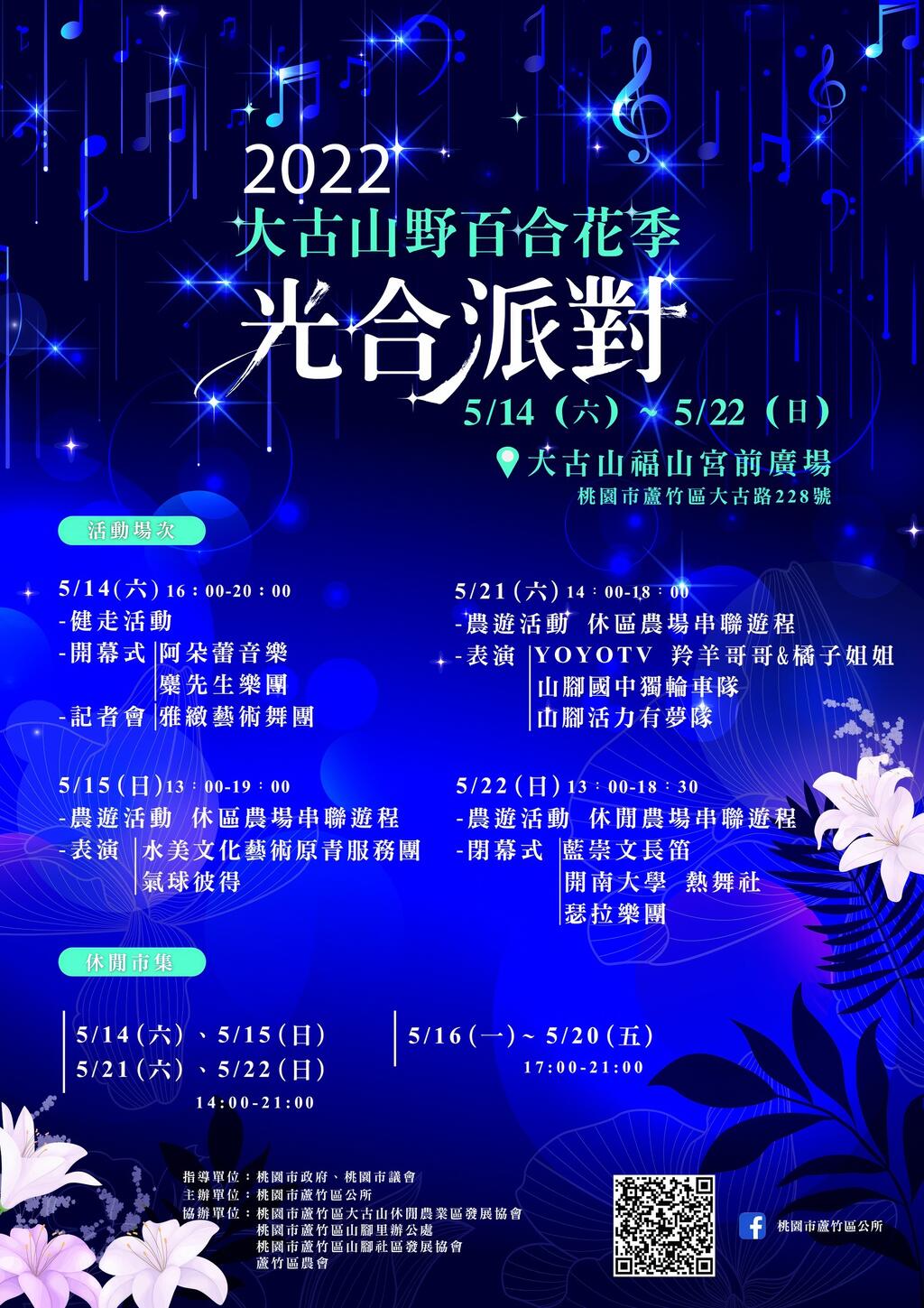 春末夏初,除了可以賞油桐花之外,當然不能忘了百合花啦!潔白中帶點嫩黃的色調配上淡淡清香,真的令人賞心悅目,今年大古山野百合花季的主題是「光合派對」,以音樂派對的形式,結合野百合舉辦一系列的活動。 平日以休閒農業市集為主,假日則有免費的農場遊程可參加,還有精彩的表演帶你一起HIGH翻天!大咖來賓有第27屆金曲獎最佳樂團獎得主麋先生、YOYO TV的羚羊哥哥、橘子姐姐、氣球彼得、瑟拉樂團等十組表演,還有季節限定的燈飾藝術,帶你漫步大古山藝術光廊,沉浸在璀璨炫麗的夜晚,一起欣賞夜景與野百合進行一場「光合派對」吧!