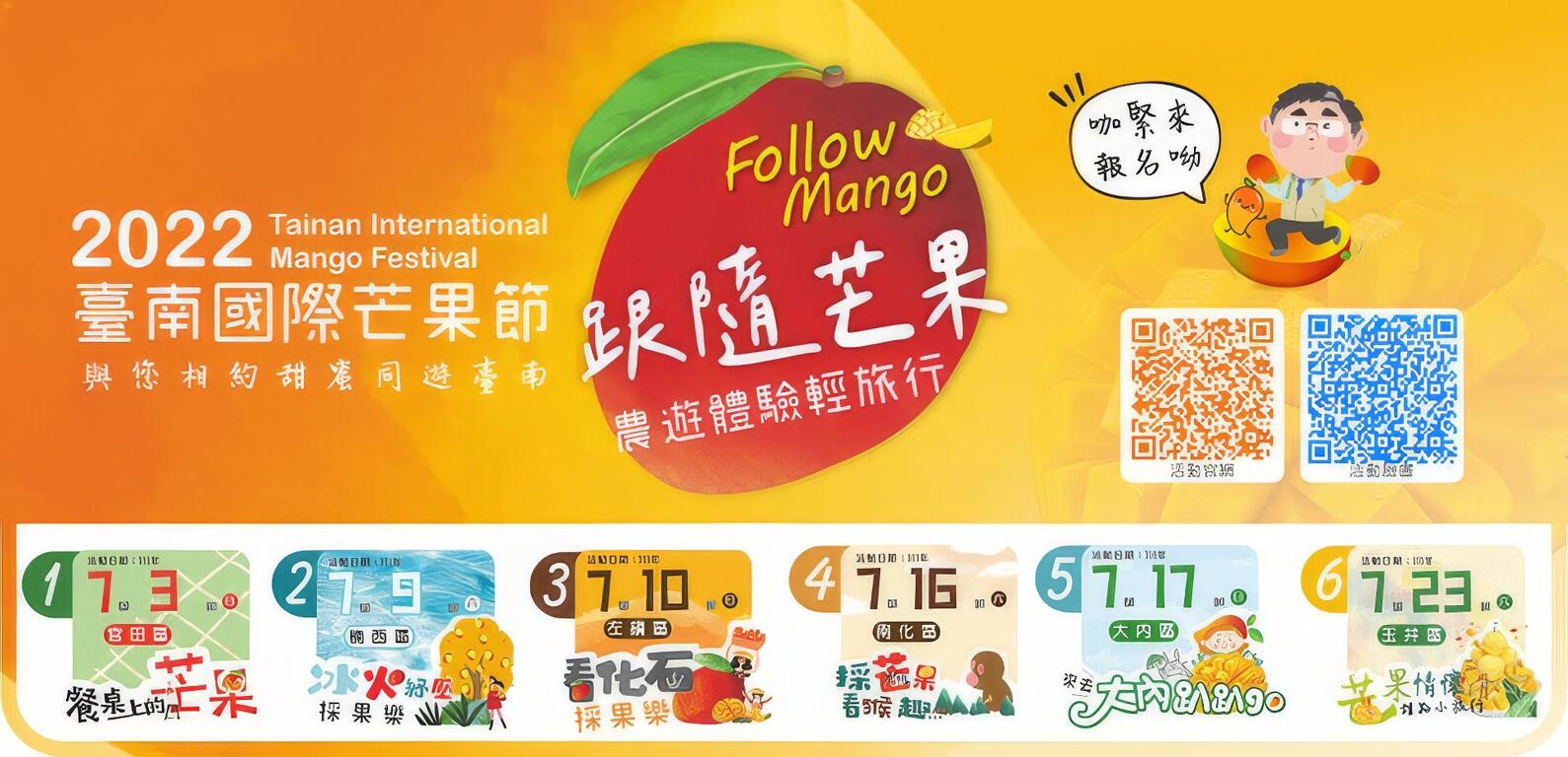 結合6區(玉井、南化、楠西、左鎮、官田、大內)分別舉辦6場在地文化導覽小旅行,搭配採果體驗以及芒果甜點DIY(視當天素材而定)和在地風味饗宴(午餐),讓臺南芒果帶您體驗獨一無二的盛夏甜蜜之旅。