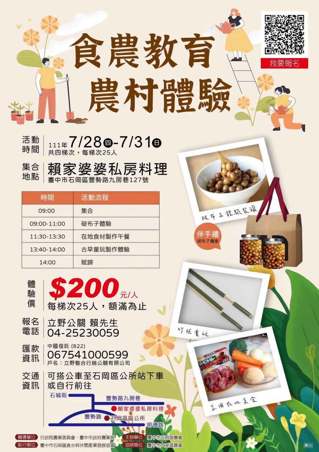 活動地點:賴家婆婆私房料理(臺中市石岡區豐勢路九房巷127號)