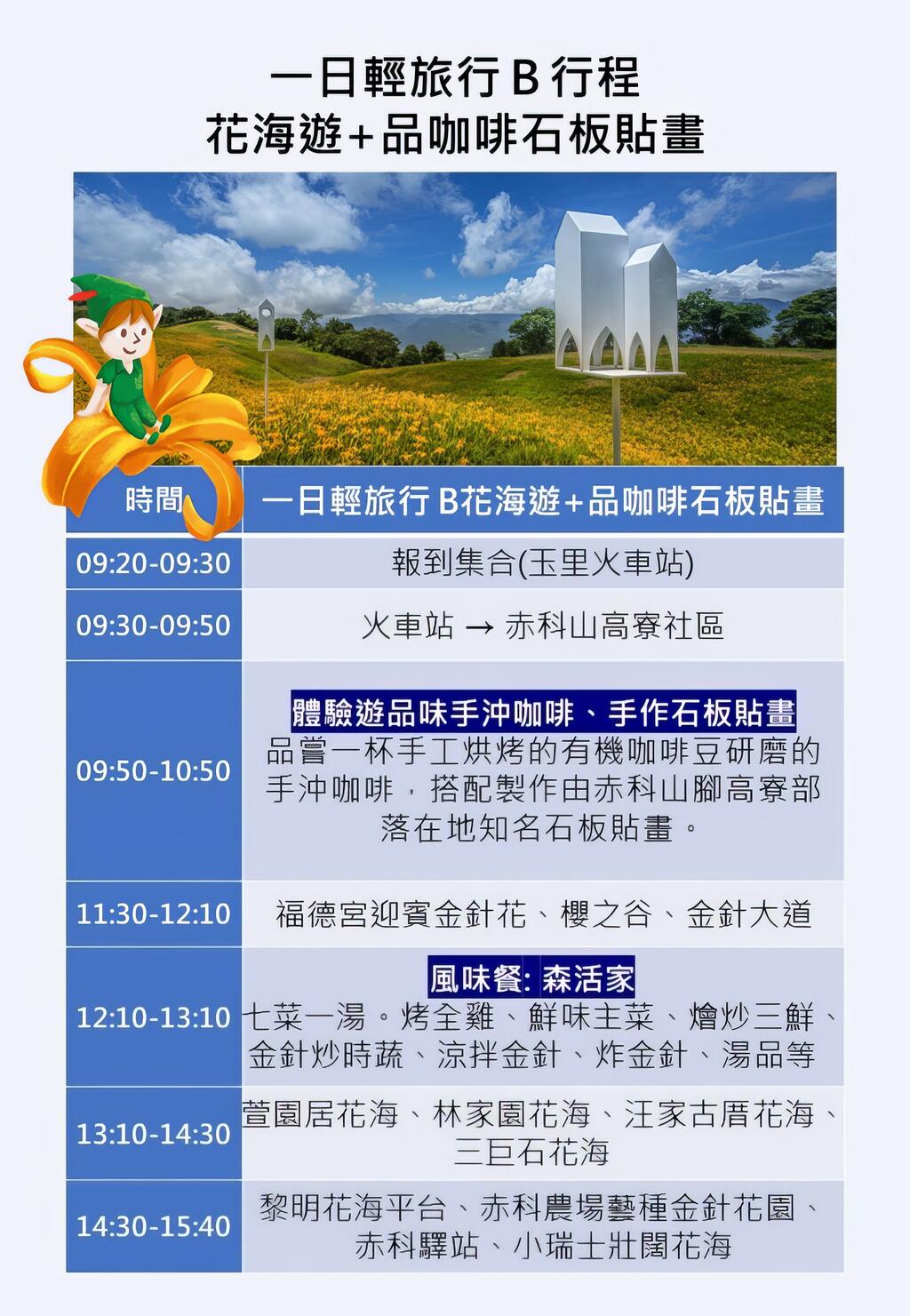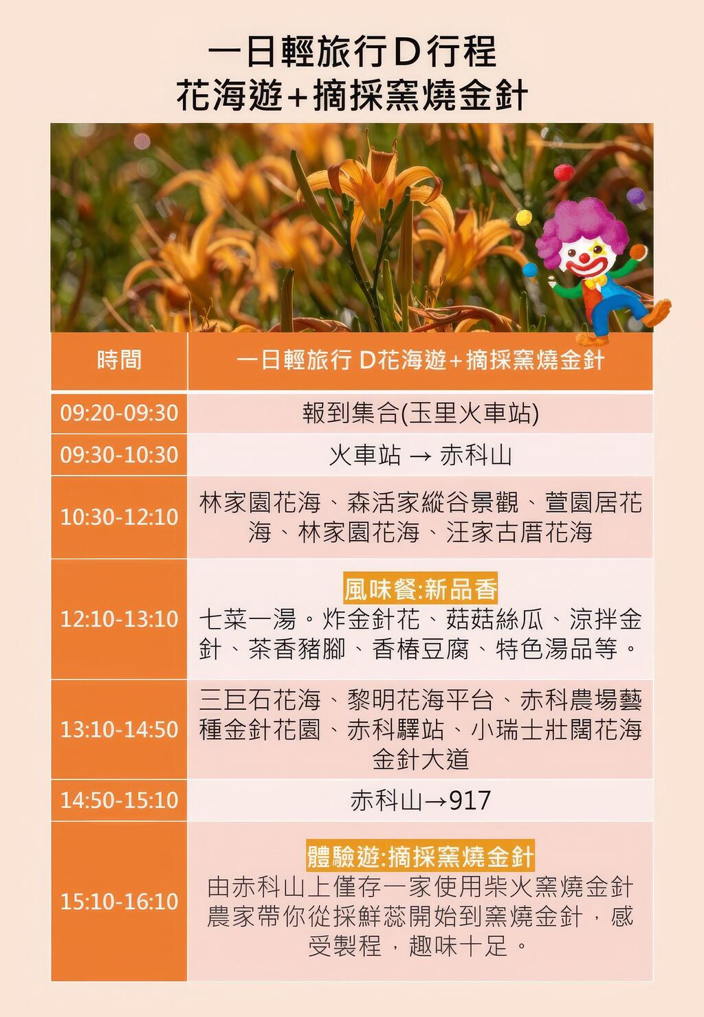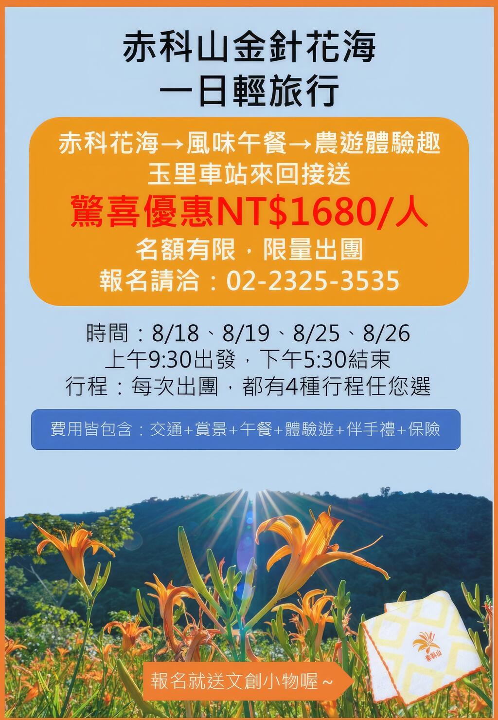 3. 本體驗活動已將時間安排於每年金針花盛開旺季,且金針花屬自然景色,受氣候影響,非人為所能控制,如花況未如預期,則依原行程前往參觀,恕不退費,敬請見諒。