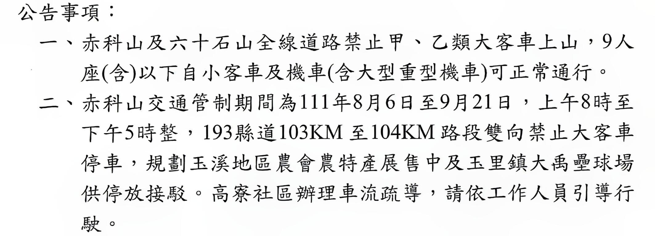 赤科山於管制期間每日早上8時至下午5時,紅綠區域禁止停車,並設置「禁止停車,違者開罰 」 告示牌 ,請執法單位協助勸導並加強取締,禁止停車路段如下 :