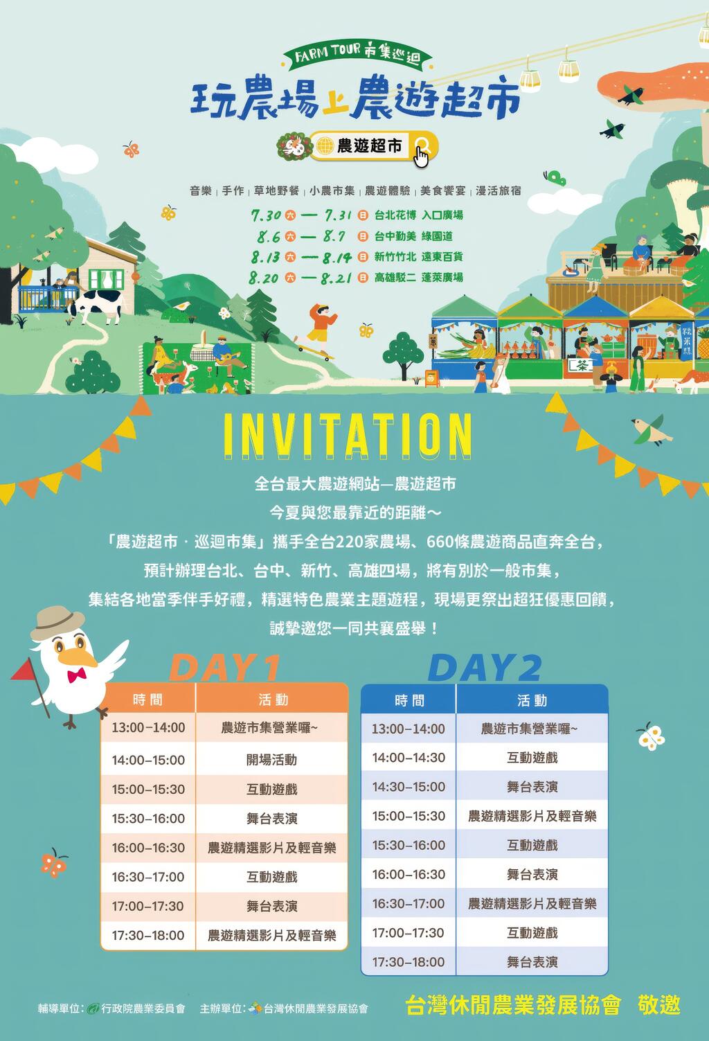 今年夏天,農遊超市攜手全台220家農場、 660條農遊商品直奔全台,預計辦理台北、台中、新竹、高雄四場「農遊超市巡迴市集」。