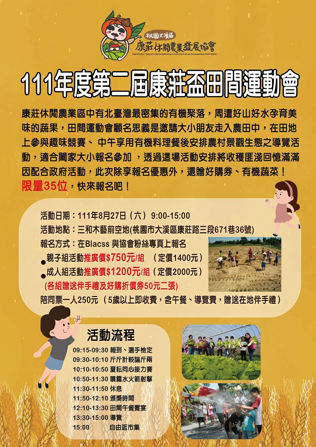 康莊休閒農業區中有北台灣最密集的有機聚落,周遭好山好水孕育美味的蔬果,田間運動會顧名思義是邀請大小朋友走入農田中,在田地上參與趣味競賽、中午享用有機料理餐後安排農村景觀生態之導覽活動,適合闔家大小報名參加,透過這場活動安排將收穫匪淺回憶滿滿因配合政府活動,此次除享報名優惠外,還贈好購券、有機蔬菜!