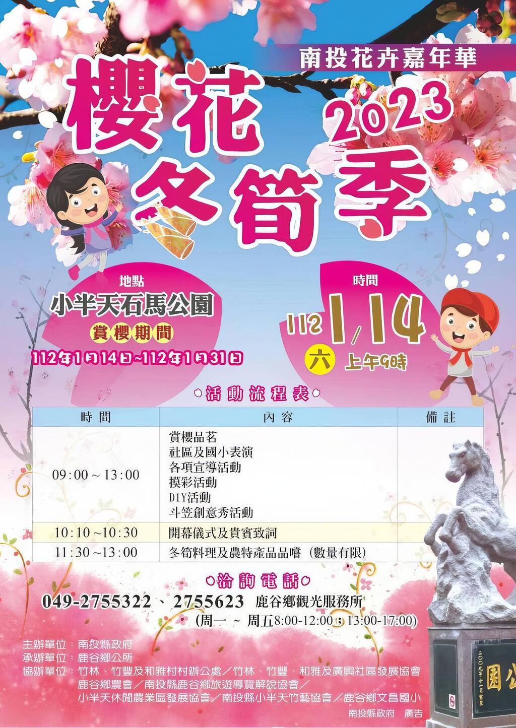 浪漫櫻花季開始啦~邀請攜伴一起來賞櫻、品茗感受小半天的浪漫與美好 這一次有好玩的體驗活動和好吃的冬筍料理品嚐唷~ 開幕日期 :2023/01/14 (六) 活動流程 :