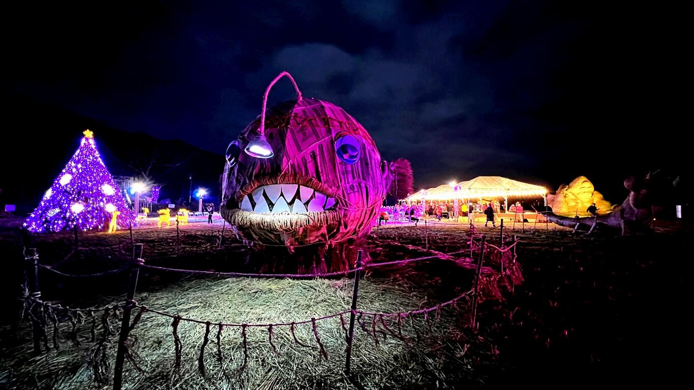 有海龜、河豚、鯊魚、鬼頭刀魚、小丑魚,其中還有寶可夢圖鑑裡也有的燈籠魚(鮟鱇魚),有著尖牙還自帶發光器俏皮又生動。花蓮富里以山巒疊翠的美景做為大地舞台,由海底動物們精彩展演!千萬別錯過唷~