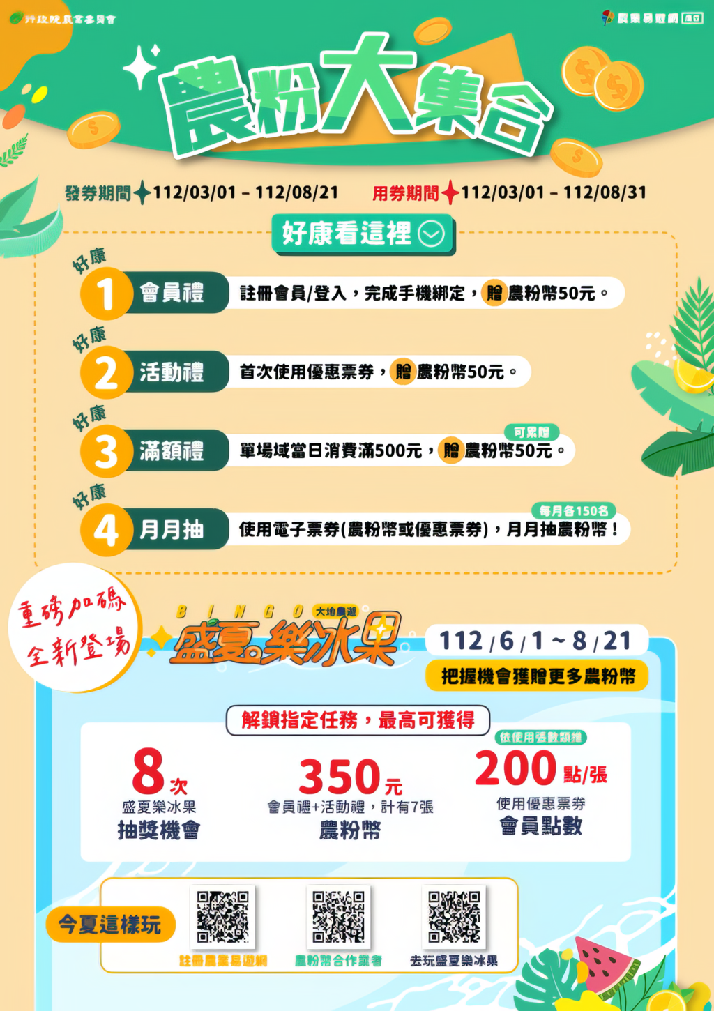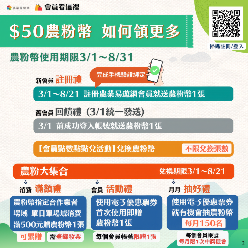 使用優惠票券,加贈農粉幣50元。(首次使用)
