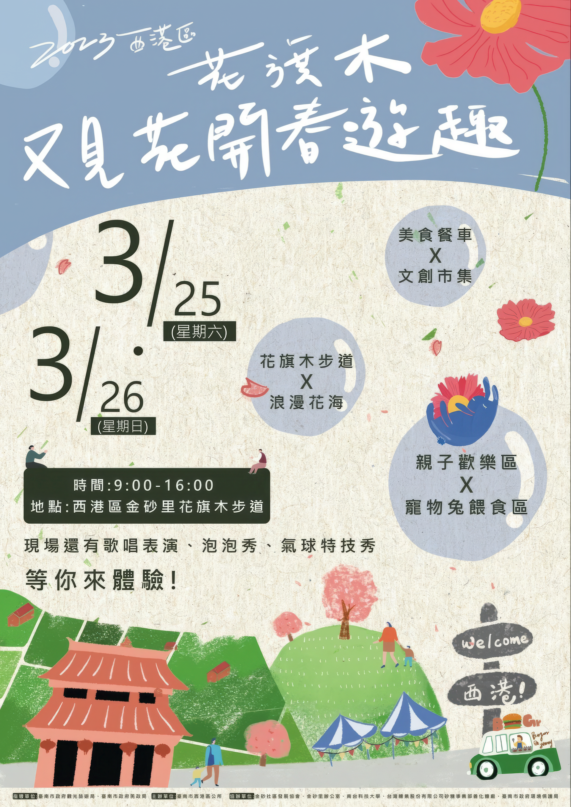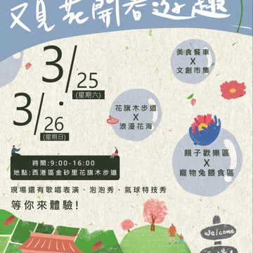 春暖花開,大地回春,3月-4月正是賞花的好時節。而花旗木花季活動也即將於3/25(六)至3/26(日)揭開序幕,不只有浪漫的粉紅步道今年更擴大波斯菊花海面積。現場不只有意文幼兒園、南臺科技大學的音樂及舞蹈表演,更有小朋友最愛的泡泡和氣球表演,加碼現場折