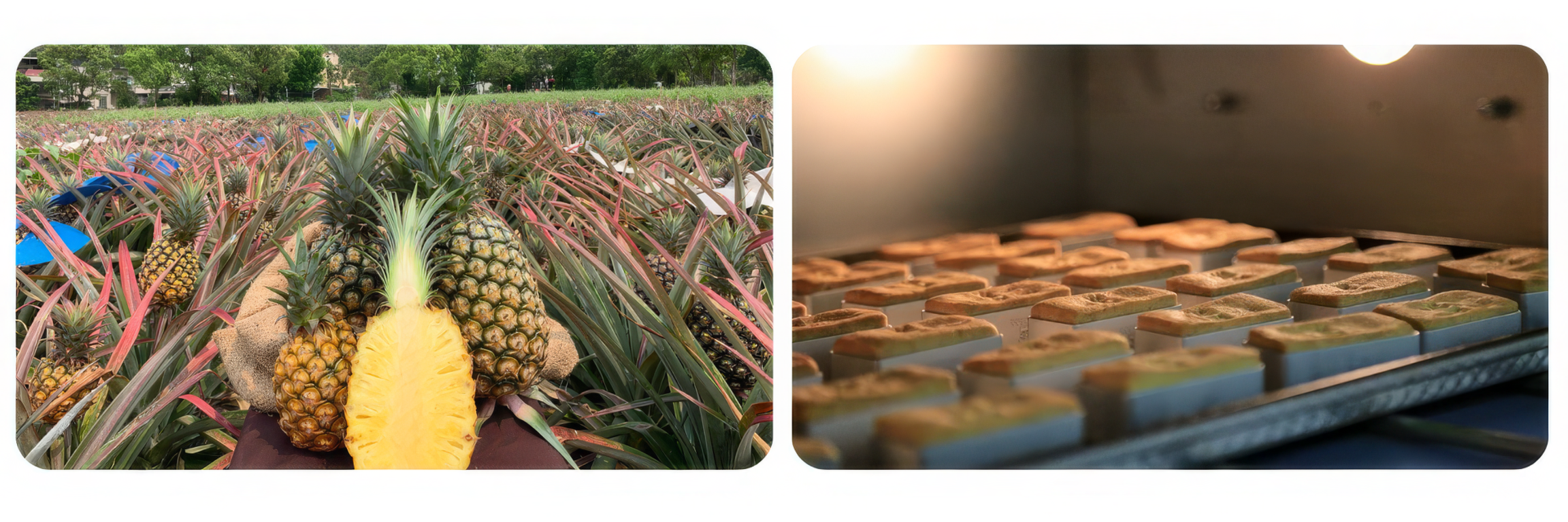 酥皮中加入屏東在地穀類紅寶石之稱有機紅藜米與自然放牧的好蛋,皆由農場所栽種與飼養,吃起來除了安心,更增添了機能性的營養成分,全用鳳梨當餡料的豪氣,才是食材的真滋味。100%天然鳳梨乾經低溫乾燥保留天然好味道,利用陶缸釀造有機糙米醋為基底,加入有機鳳梨靜置融合,為健康打氣,為人生提味。
