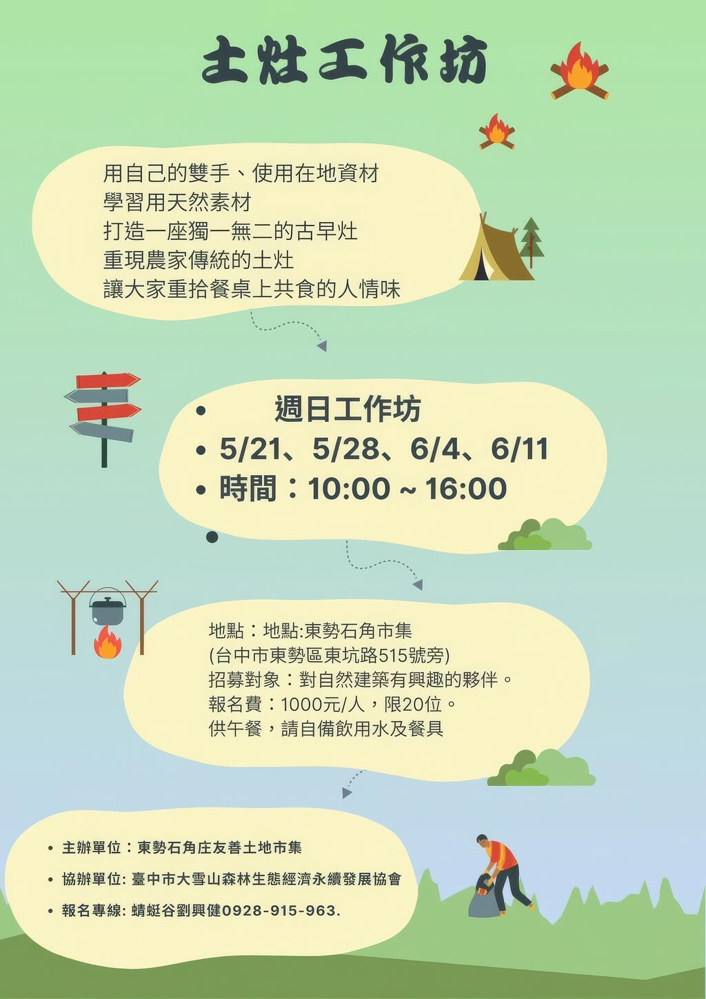 活動日期| 每周日 5/21、5/28、6/4、6/11 ;10:00-16:00 活動地點|📍 東勢石角市集 (台中市東勢區東坑路515號旁) 招募對象|對自然建築有興趣的夥伴 報名費用|$1,000元/人,限20位