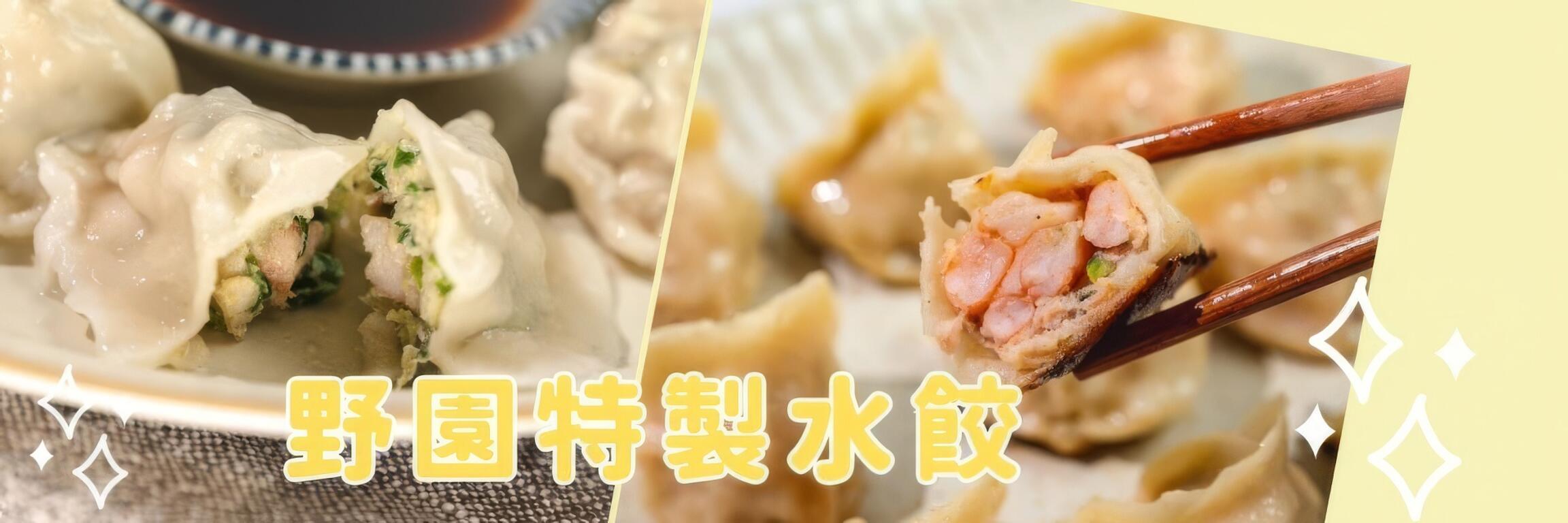 享用野園水餃;每份$150元10顆 (可選擇 櫛瓜鮮蝦/韭菜鮮蝦)