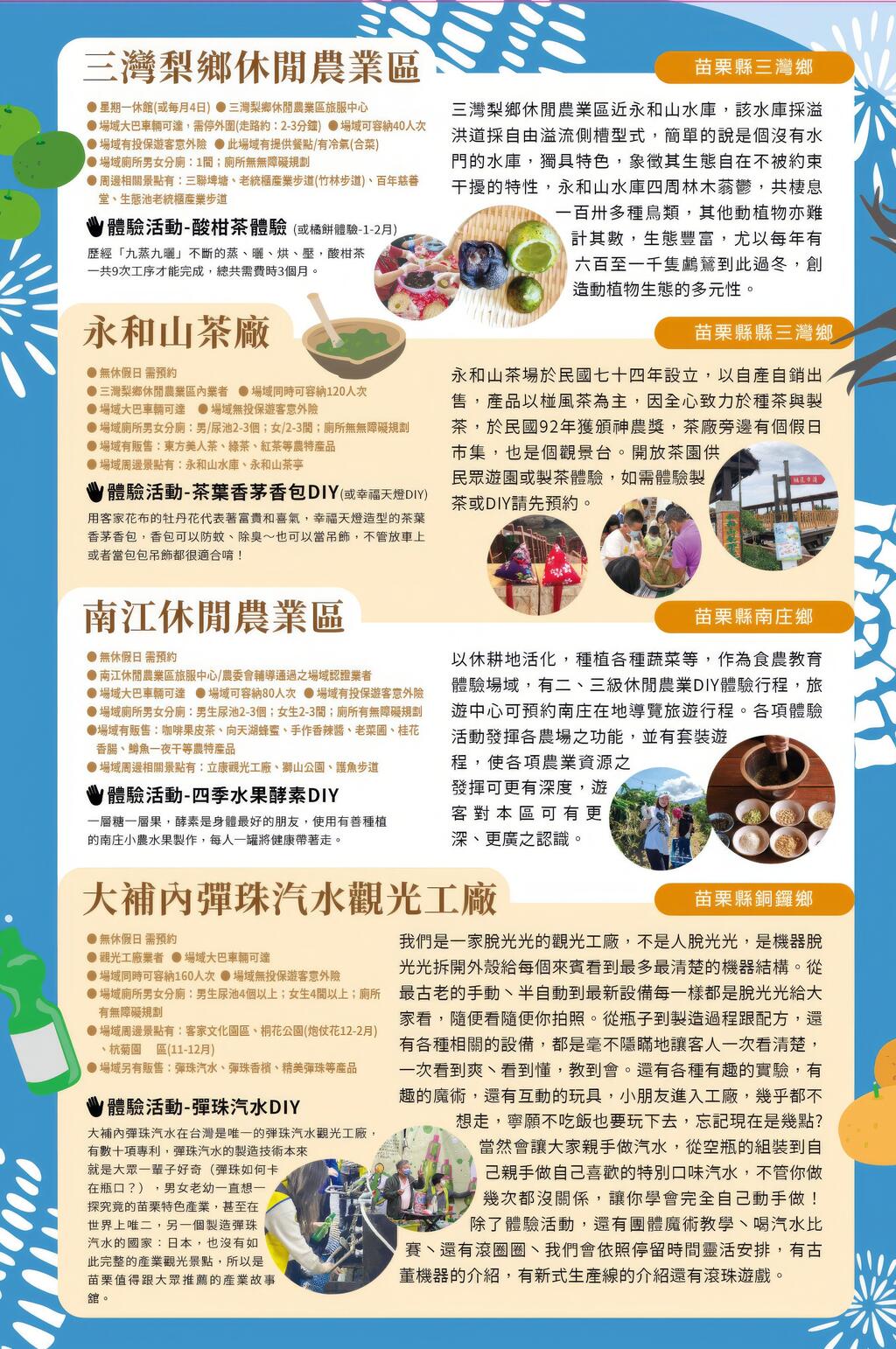 景點介紹-三灣梨鄉休閒農業區、永和山茶廠、南江休閒農業區、大補內彈珠汽水觀光工廠