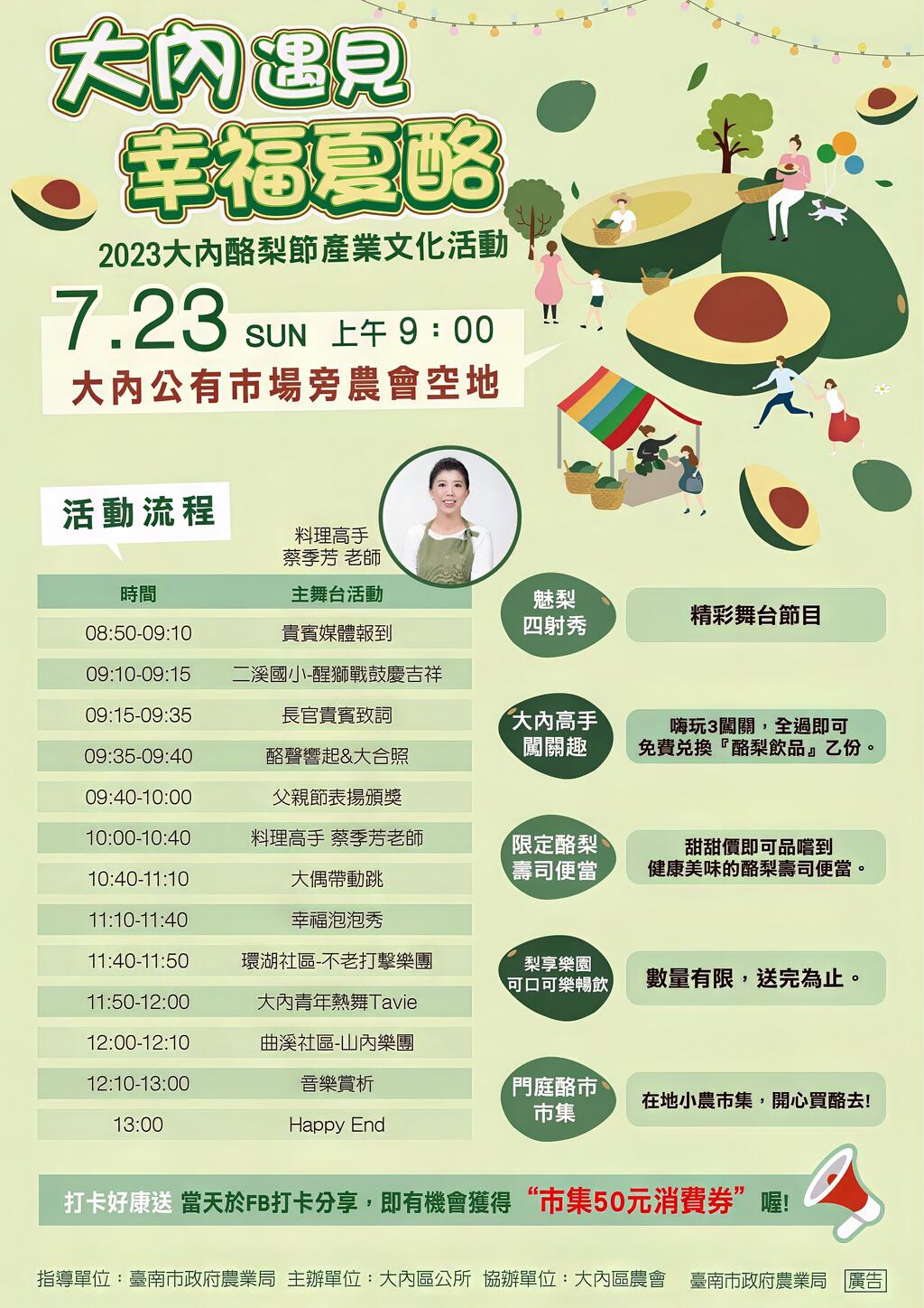 夏季又到了品嚐幸福水果酪梨的季節,這次邀請到料理達人蔡季芳老師教大家如何挑選好酪梨,還能製作出美味的酪梨料理,一起到現場闖關、逛市集,找大內幸福的夏酪滋味~