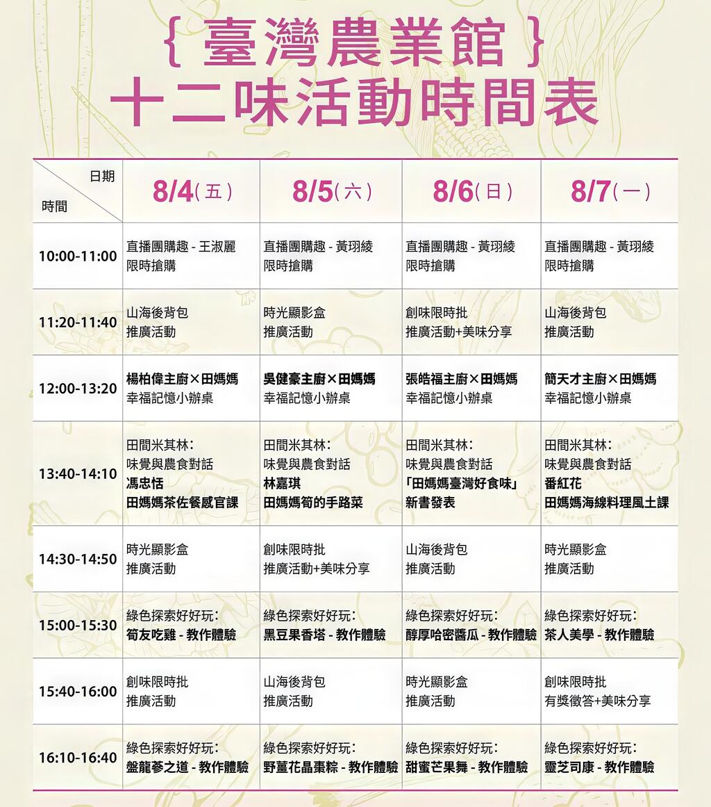 今年「臺灣農業館」以《食光顯影盒:老蒔新味喚醒記憶味蕾》、《創味限時批:土地食材創新解構》、《山海後背包:農廚體驗勾串土地密碼》等三大主題進行策展,集結全臺田媽媽餐廳、青年農民、農(漁)會、農遊超市,獻上一期一會的臺灣旬味鉅作。在地生產的季節好食材、特色美食料理、節氣農遊,以及地區限定伴手,邀請民眾五感共享、驚艷味蕾。