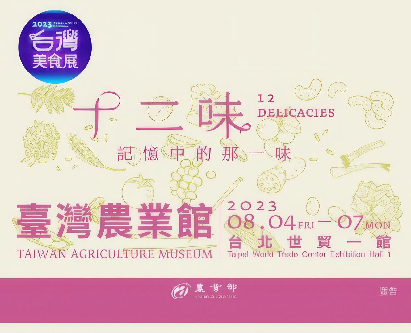 2023台灣美食展農業館「記憶中的那一味,12味幸福傳承」於2023年8月4日至8月7日於世貿一館盛大開展。農業不只是農業,它連結了土地、世代與感情,是勾起內心最深處幸福回憶的風味索引。2023台灣美食展臺灣農業館重新釋義農食、農創、農遊的記憶符號、情感體現,以及生命中的風景,把臺灣島上一年12個月所擁有的繽紛農產,歸結成生生不息哺育農業與飲食文化的資糧。