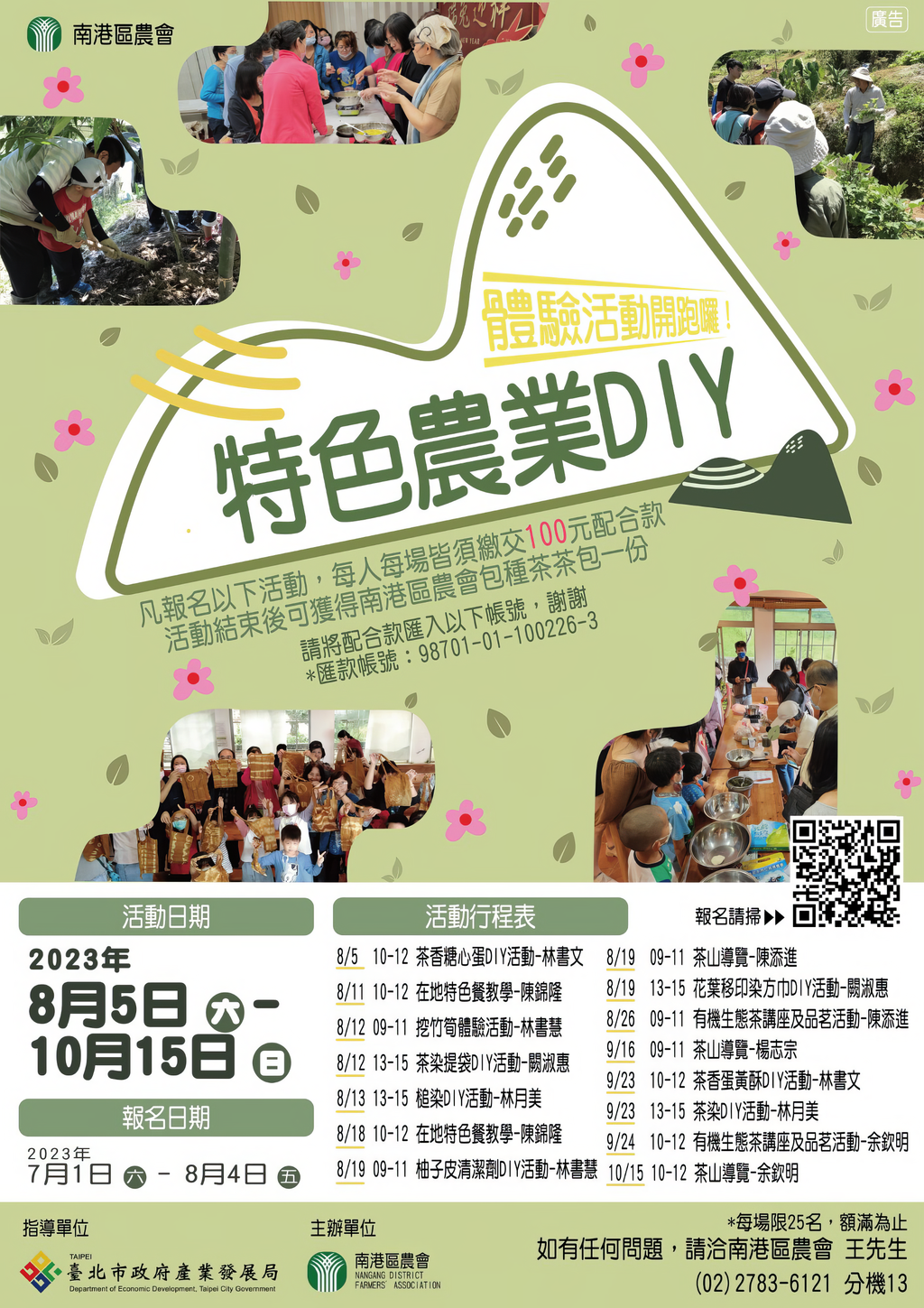 提醒您,凡報名本次活動每人每場皆須繳交100元配合款,活動結束後可獲的南港區農會包種茶茶包一份!