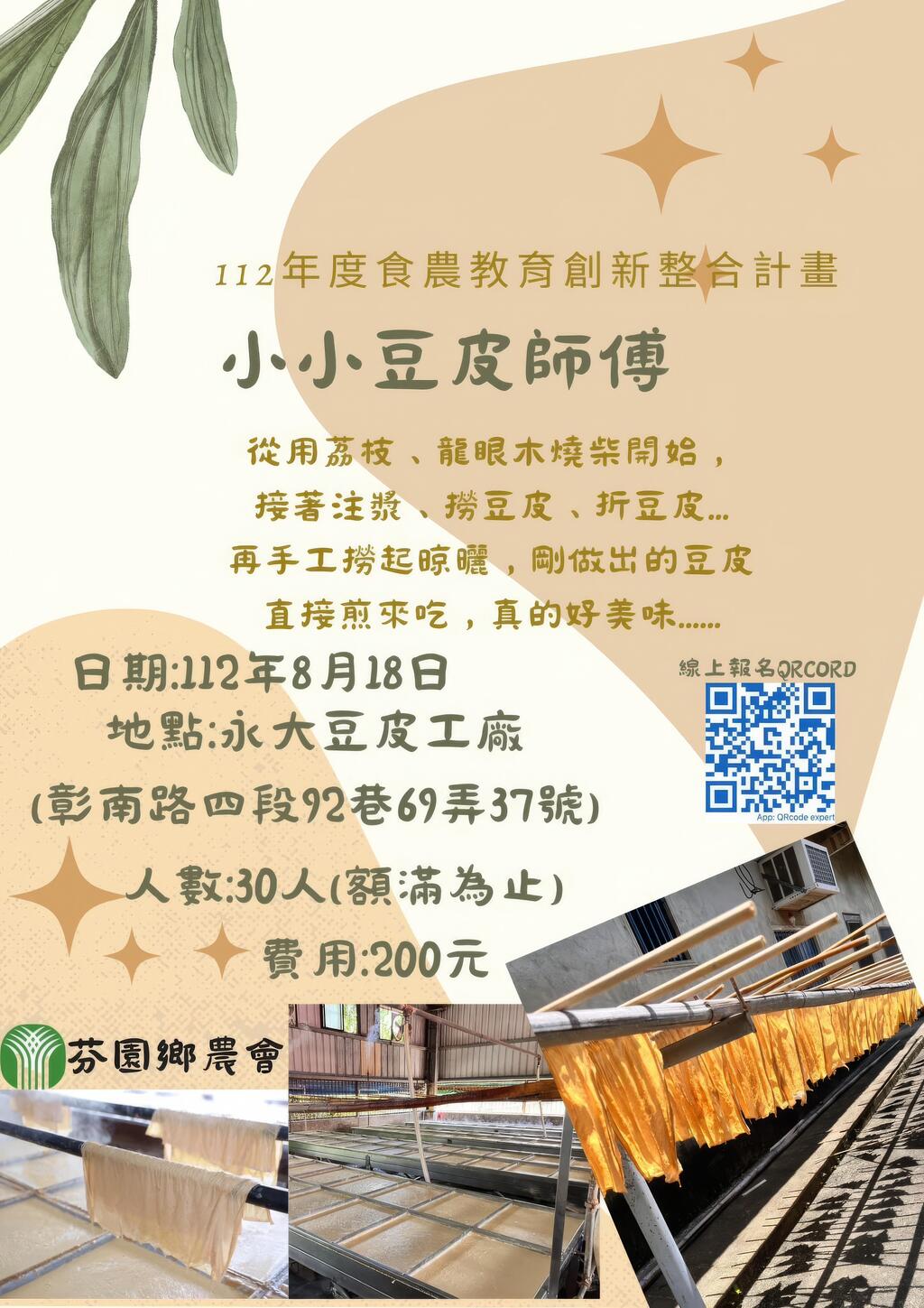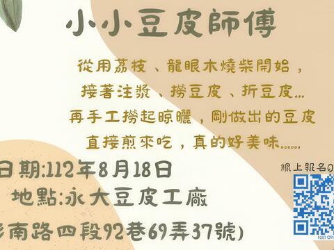 活動日期|112/8/18 (五) 活動報名|0 49-2522216 活動地點|📍永大豆皮工廠 (彰南路四段92巷69弄37號) 活動費用|$200元/人 ✦ 預計招募30人,額滿為止