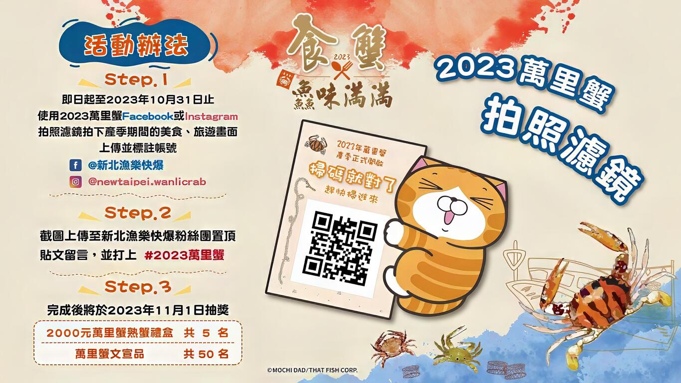 👉Step 1 即日起至2023年10月31日止,使用2023萬里蟹拍照濾鏡拍下產季期間的美食、旅遊畫面上傳並標註帳號 @新北漁樂快爆 (FB) @newtaipei.wanlicrab (IG)